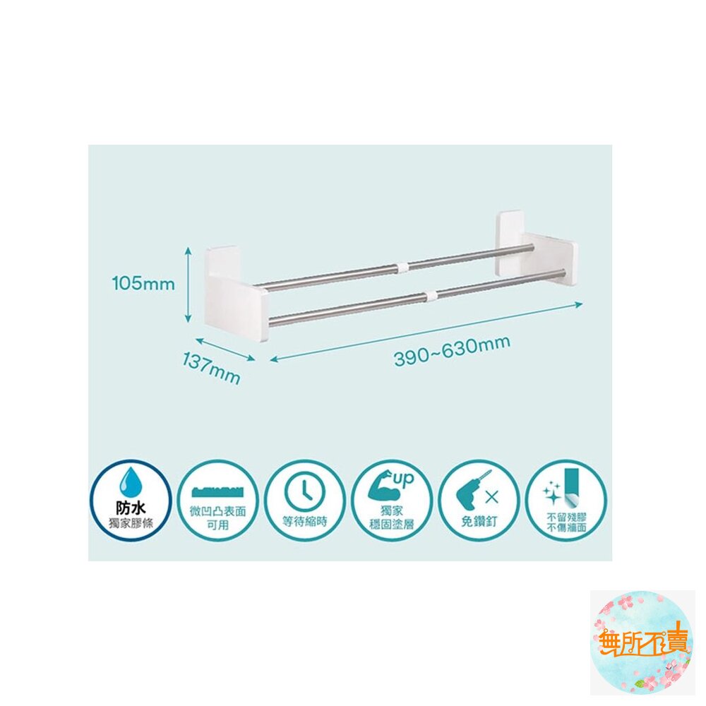 1個雙層伸縮毛巾架 + 4片大型無痕防水膠條 + 1 片穩固專用棉片