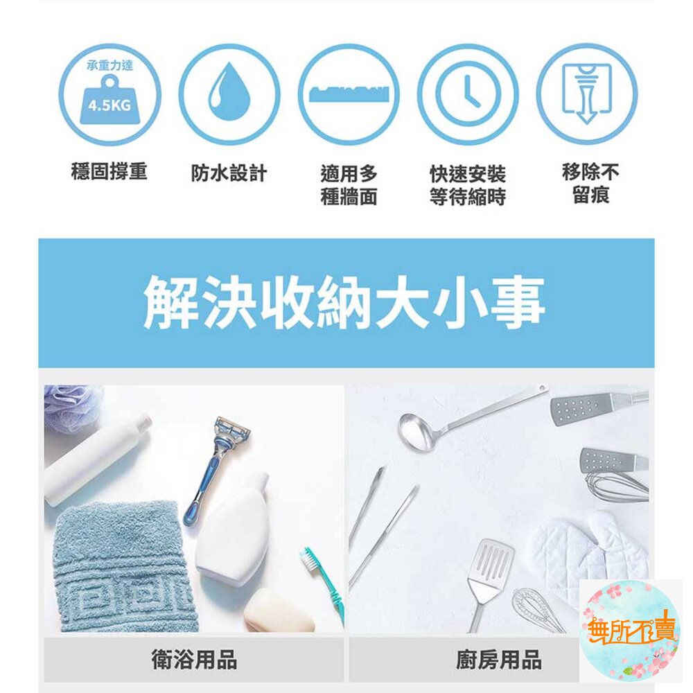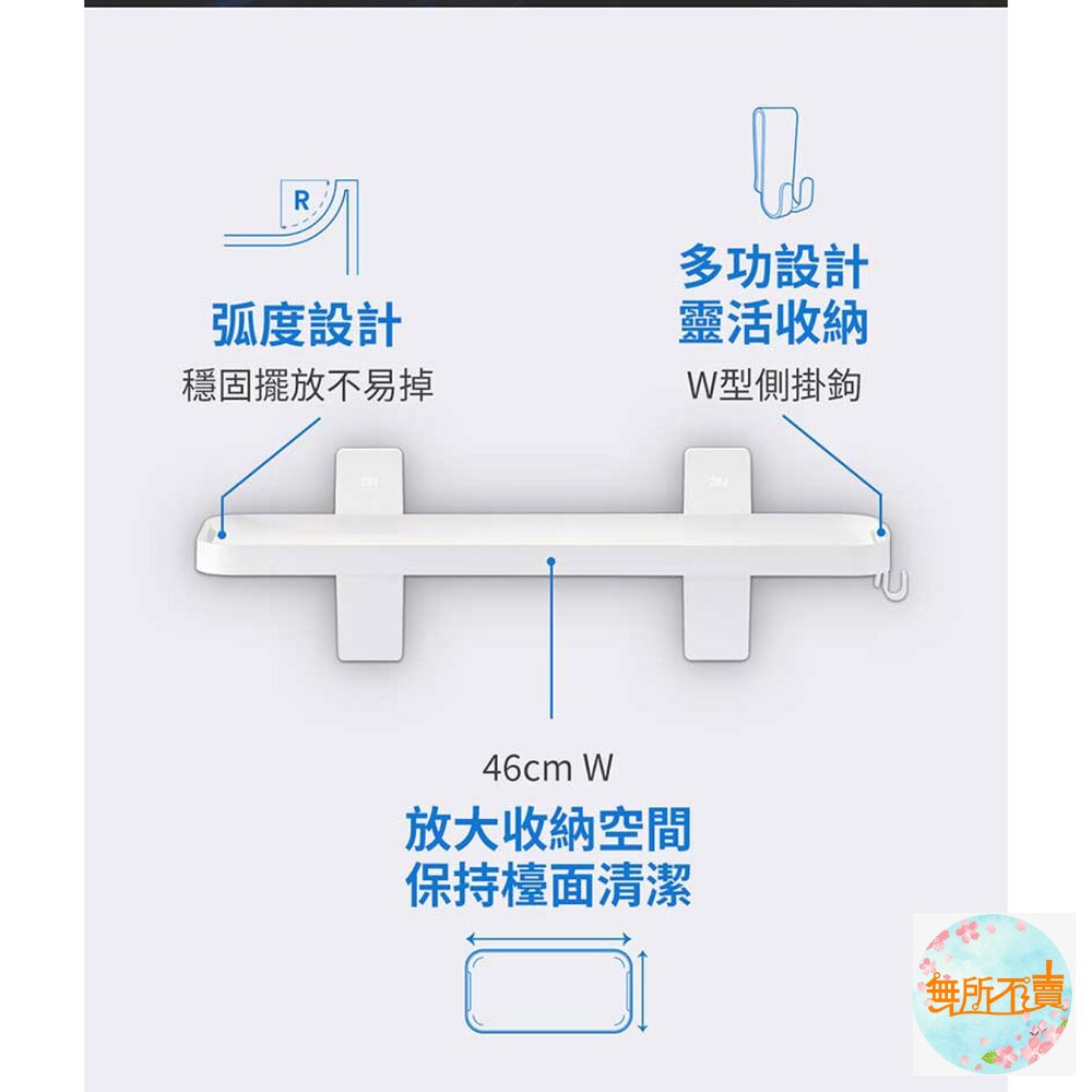 此商品尺寸較大,限蝦皮店到店1個,無法與其他商品合併,超過請選賣家宅配 ◆防水膠條耐高溫濕氣,等待縮時 ◆免鑽釘/不殘膠/不傷牆/不易鏽 ◆適用多種牆面,微凹凸表面也可用 ◆可當陳列架,W型側掛鉤更靈活收納 ◆適用廚房/衛浴/臥室各種居家空間 ◆承重力升級達4.5kg ◆賣場有販售膠條,可購買備用 內容物:置物架x1 側掛鉤x1 背板x2 防水膠條x4 尺寸:46.1x14.7x15.6