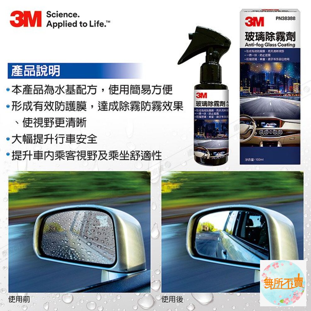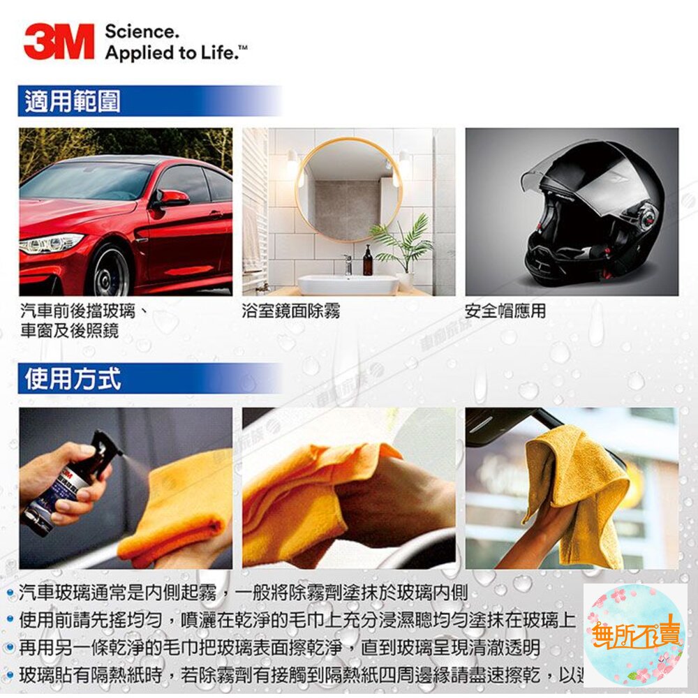 一噴一抹、防止起霧 形成有效防霧膜、雨天清晰視野 前擋玻璃、車窗、鏡子等多部位使用 使用於前擋玻璃,應使用於玻璃內側