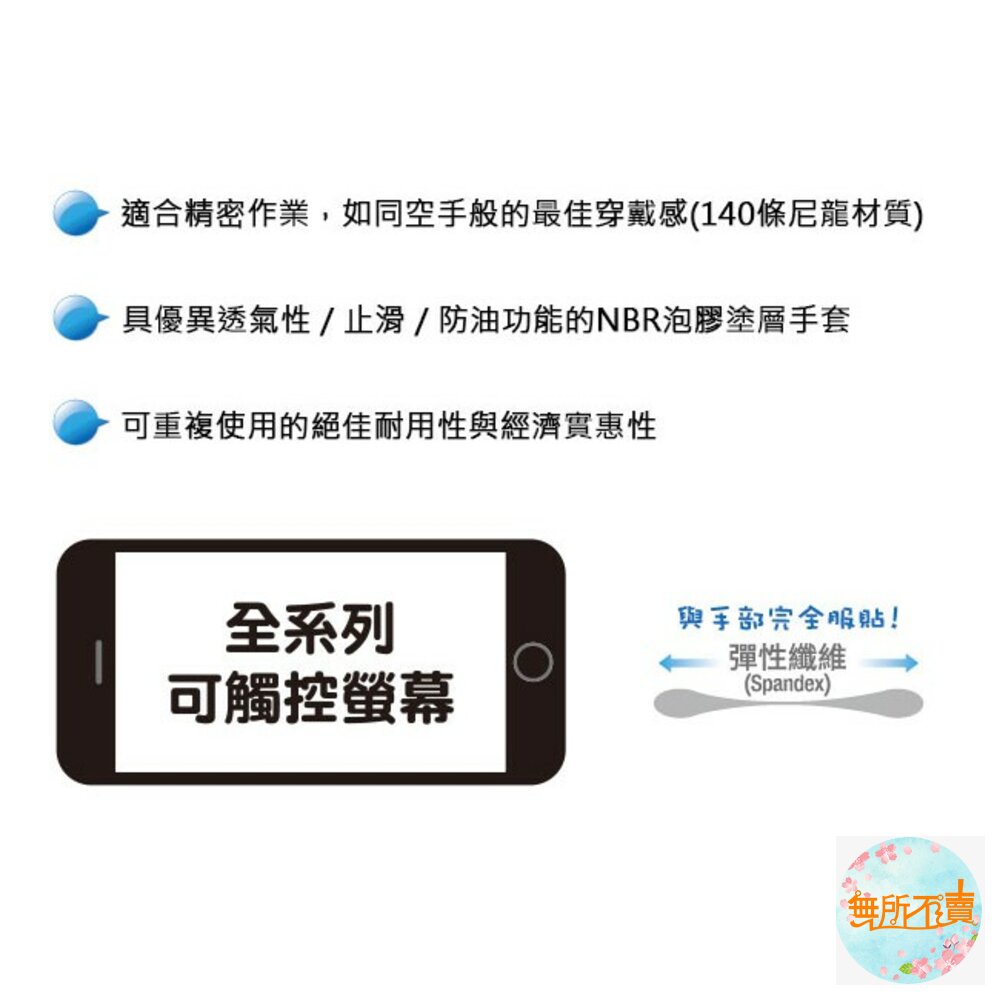 ◆與手部完全服貼,可觸控手機螢幕 ◆適合精密作業,如同空手般的最佳穿戴感(140條尼龍材質) ◆具優異透氣性/止滑/防油功能的NBR泡膠塗層手套 ◆可重複使用的絕佳耐用性與經濟實惠性