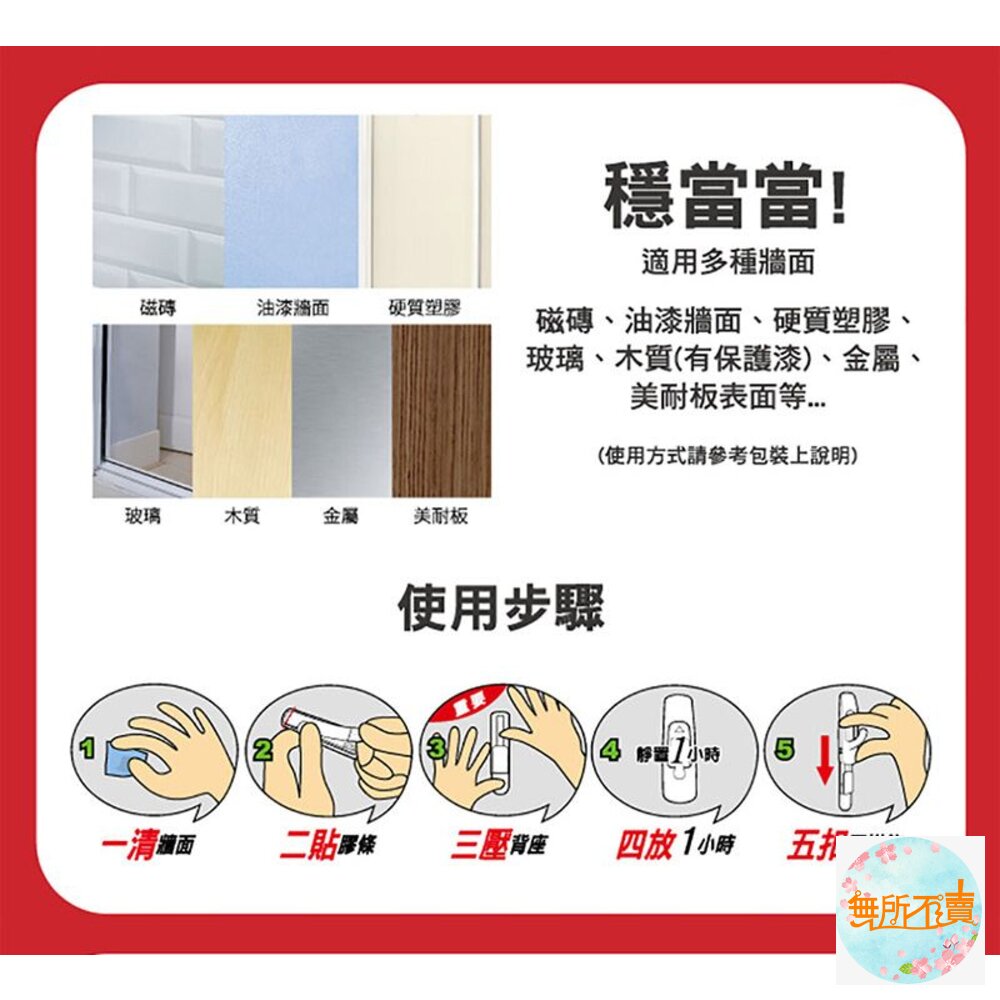 內容量:1個掛鉤 2個背板 2片無痕大型膠條