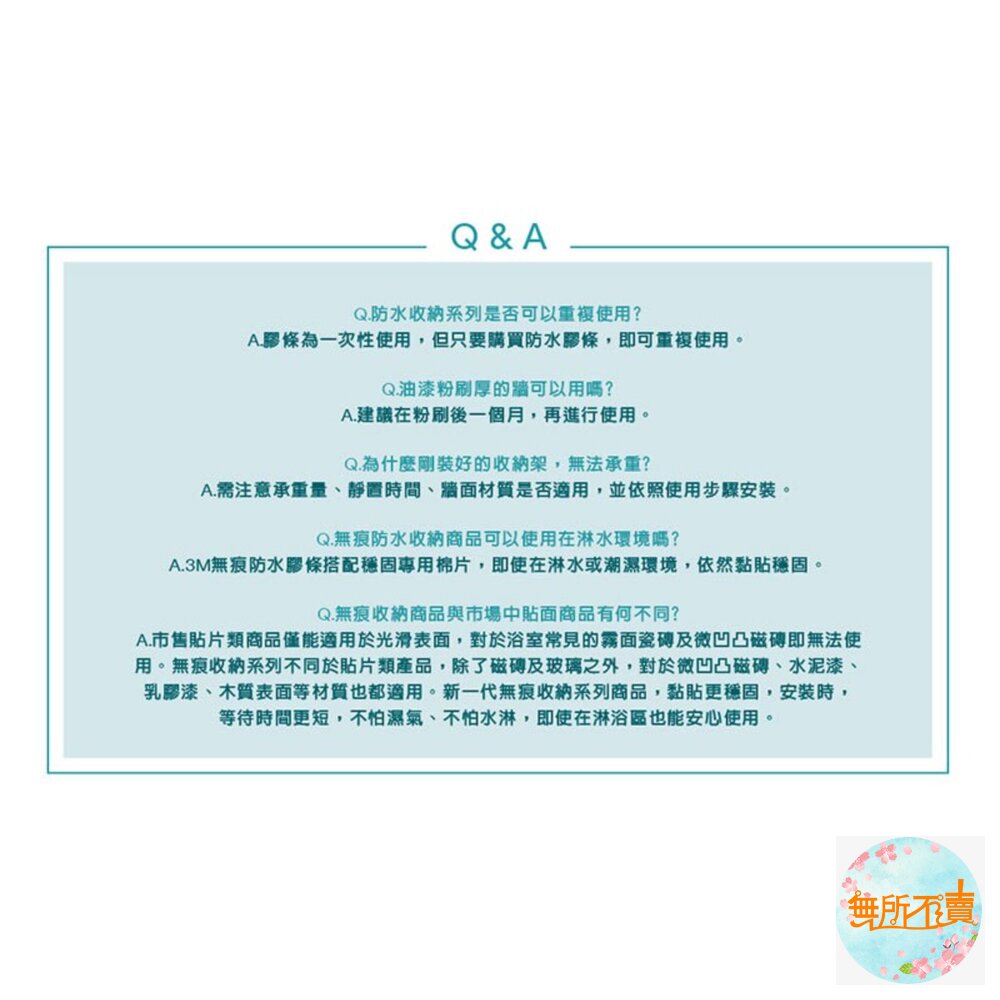 使用3M獨家無痕防水膠條,全新強力膠層,抗水氣、超防水。搭配穩固專用棉片,等待時間縮短,即使在淋水或潮濕環境,依然黏貼穩固。