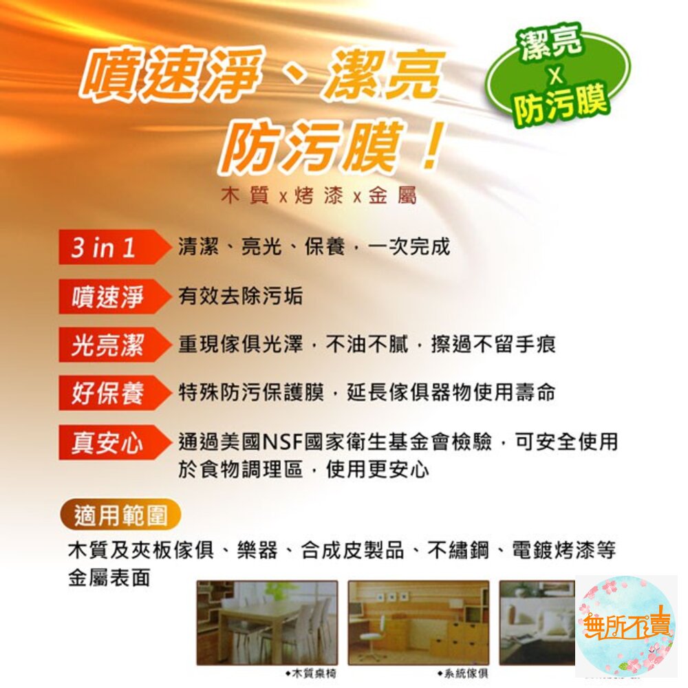 ★適用於如:木質、金屬傢俱、不鏽鋼製品、木製上漆傢俱、衣櫃、視廳櫃、梳妝台、桌子、美耐板、相框…等各類傢俱表面之清潔亮光