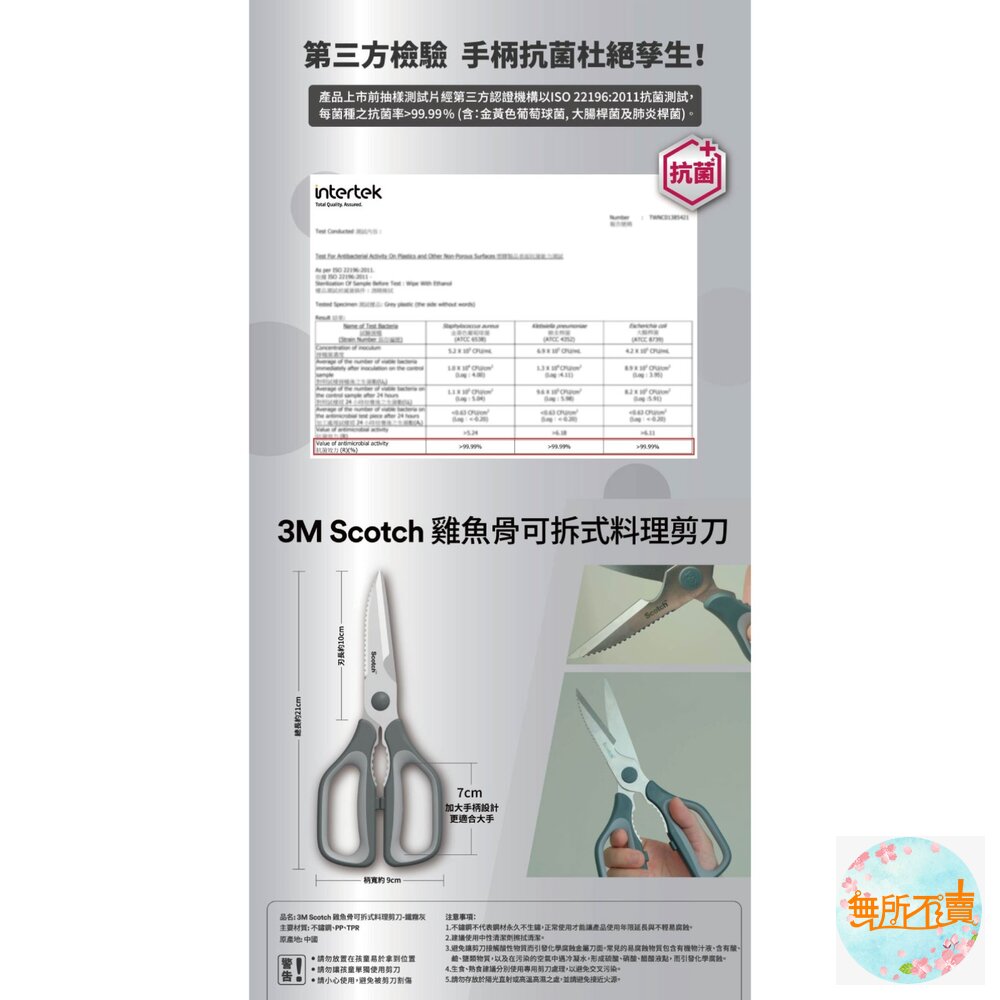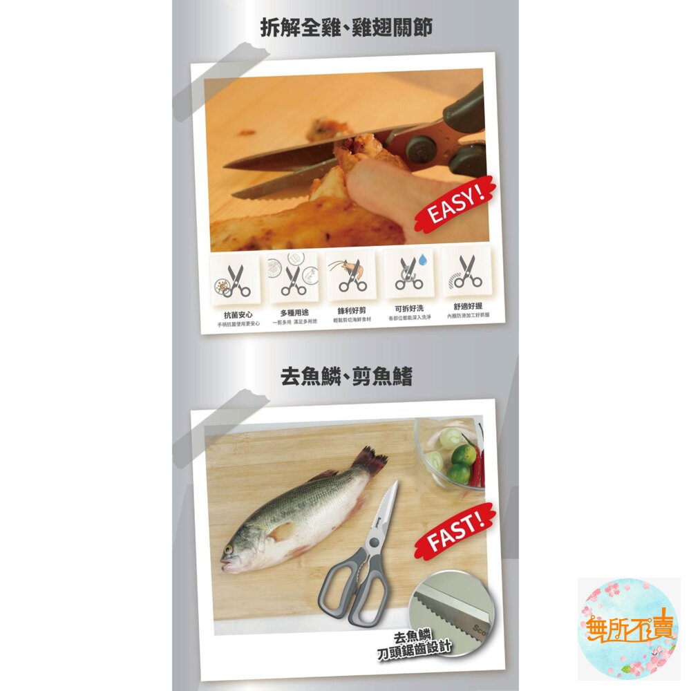 手柄9吋加大 刀頭鋸齒設計,方便去魚鱗 可拆式結構設計,清潔無死角 抗菌舒適握柄,安全衛生 高硬度材質,耐用升級 防滑凹口設計,輕鬆剪雞骨 鋸齒設計,輕鬆破殼 材質:不鏽鋼、PP、TPR 尺寸 長10,寬1.3,高23公分 重量 0.12公斤 產地 中國