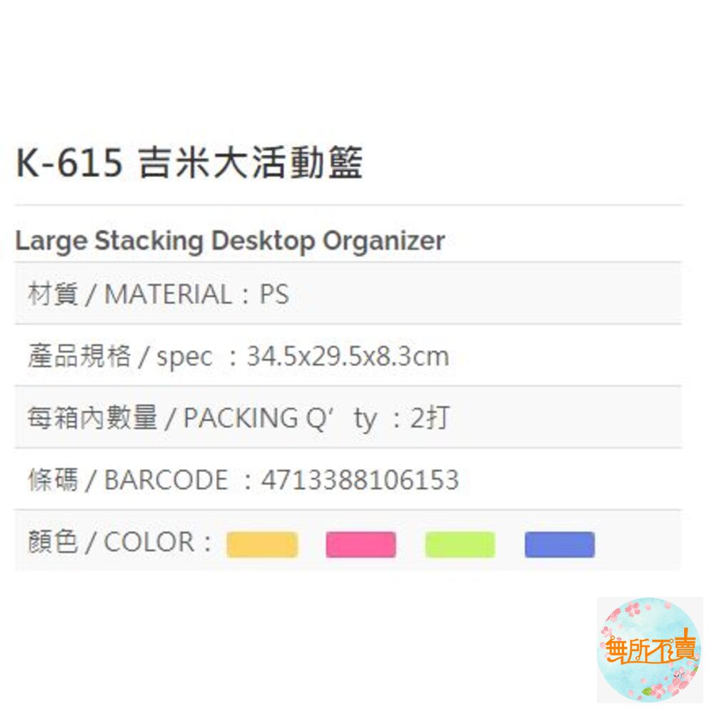 不可選色,隨機出貨 蝦皮/超商最多只能4個 材質 / MATERIAL:PS 產品規格 / spec :34.5x29.5x8.3cm 每箱內數量 / PACKING Q’ty :2打 條碼 / BARCODE :4713388106153