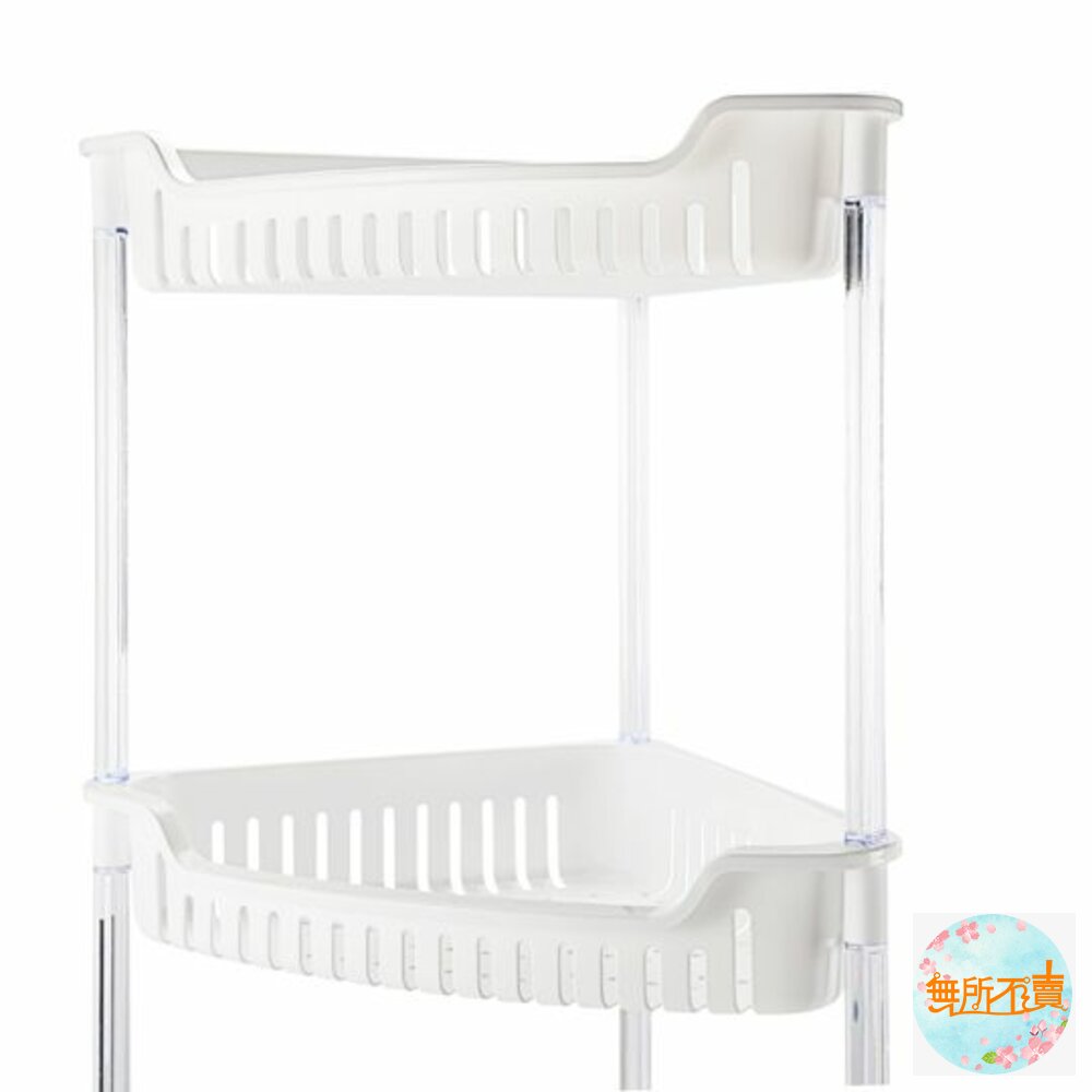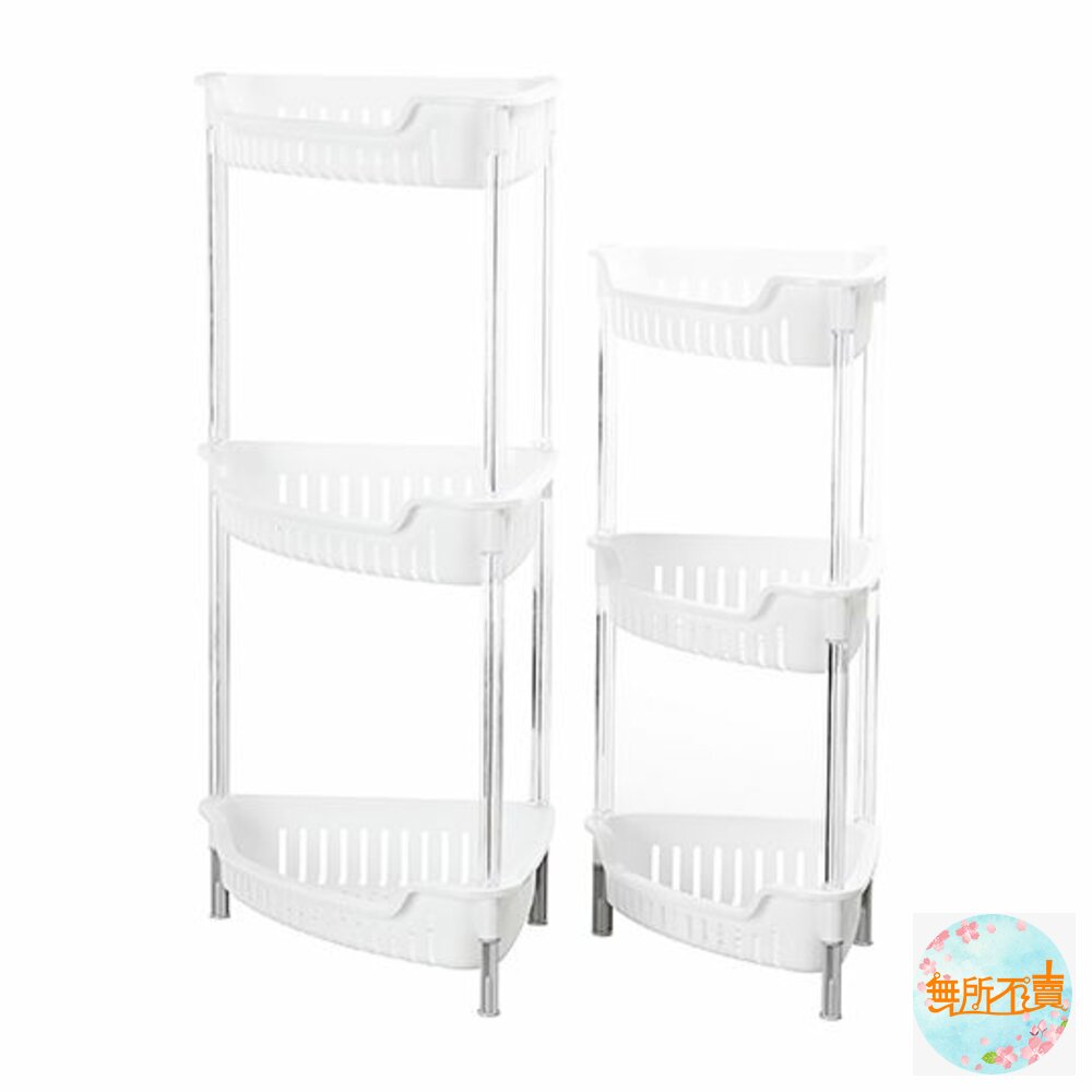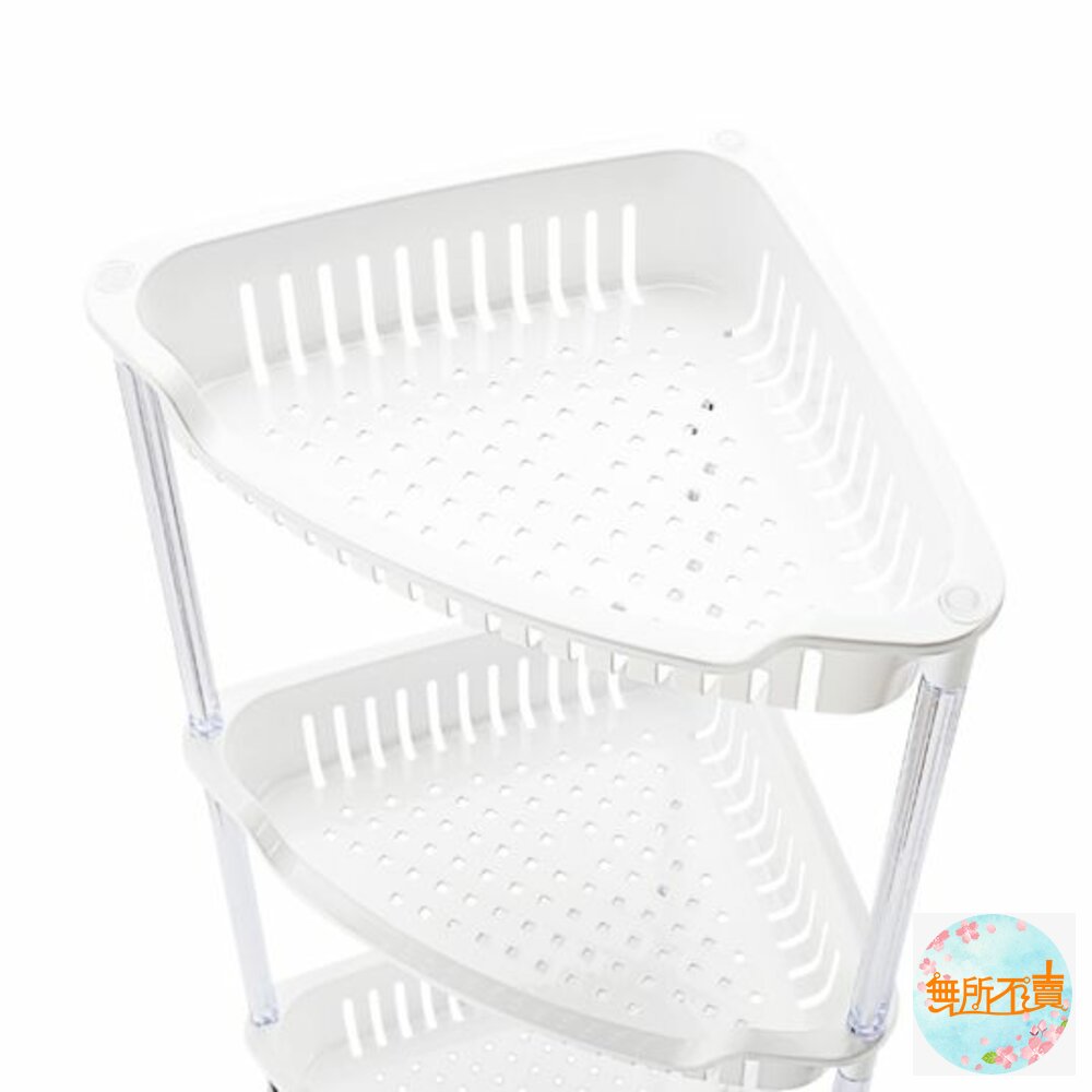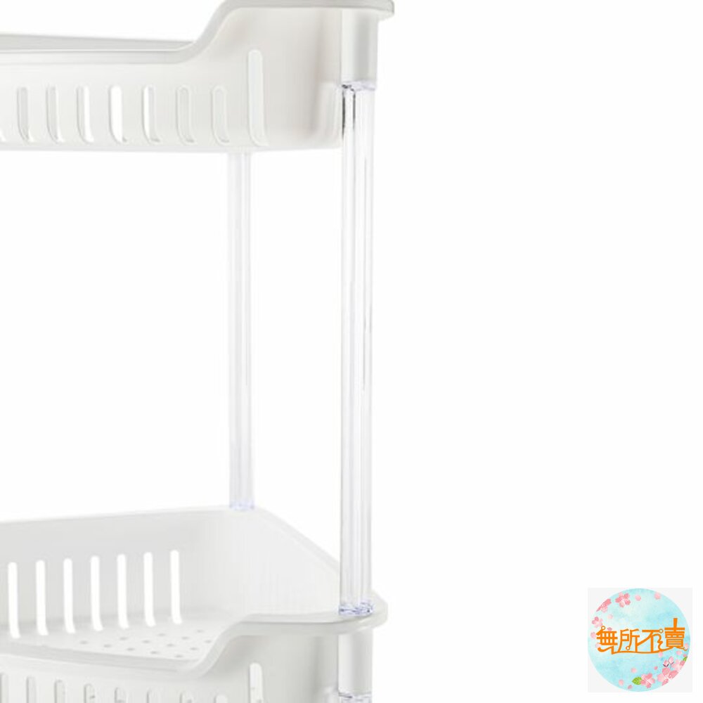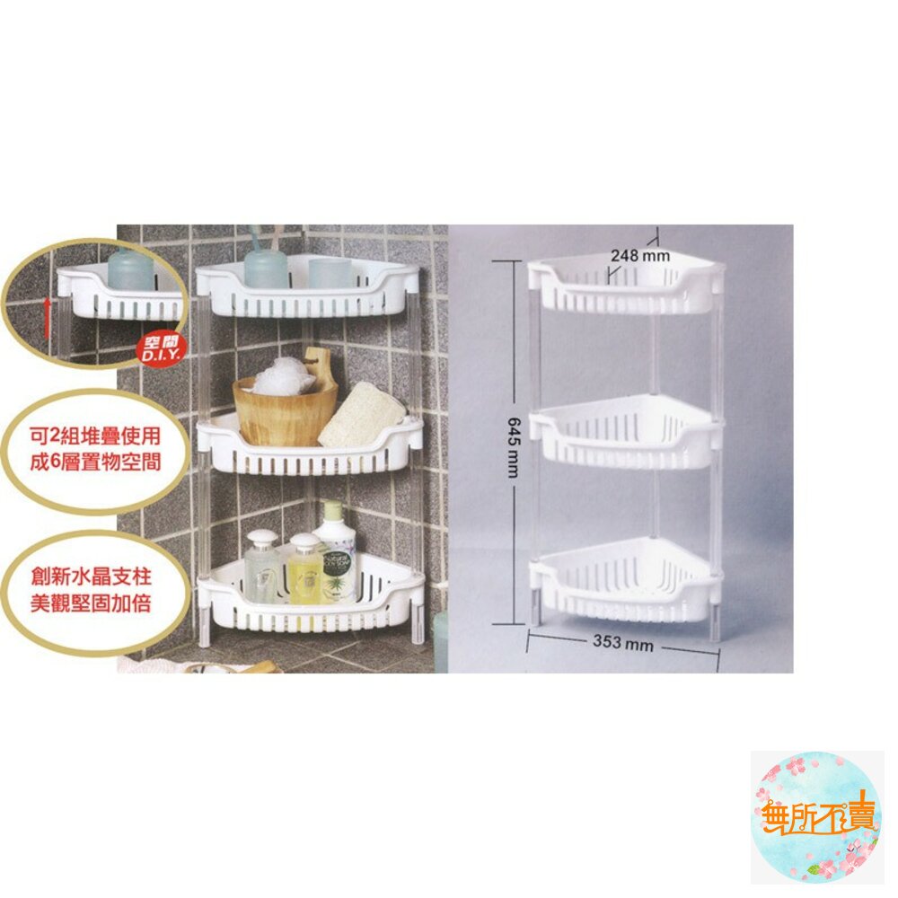 超取限1個 AE-283溫哥華三層三角架 產品編號:AE283 尺寸:353x248x645mm 產品特色三角型設計,可放置於空間角落,透孔設計,通風瀝水,便利層架,組裝容易;皎潔淨白色調,水晶般剔透長柱與凹口設計,便於取物,底部墊高設計可防潮,可置於廚房流理台、衛浴等空間,有兩種尺寸,可供選擇。