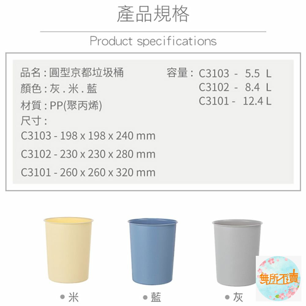 C3102 中圓型京都垃圾桶 產品編號:C3102 尺寸:230x230x280mm 容量:8.4 Liters 產品特色 簡便丟垃圾,圓型設計,表面作仿針織紋處理,有三種尺寸之產品,可供挑選;低調灰、沉穩藍,任君選擇。