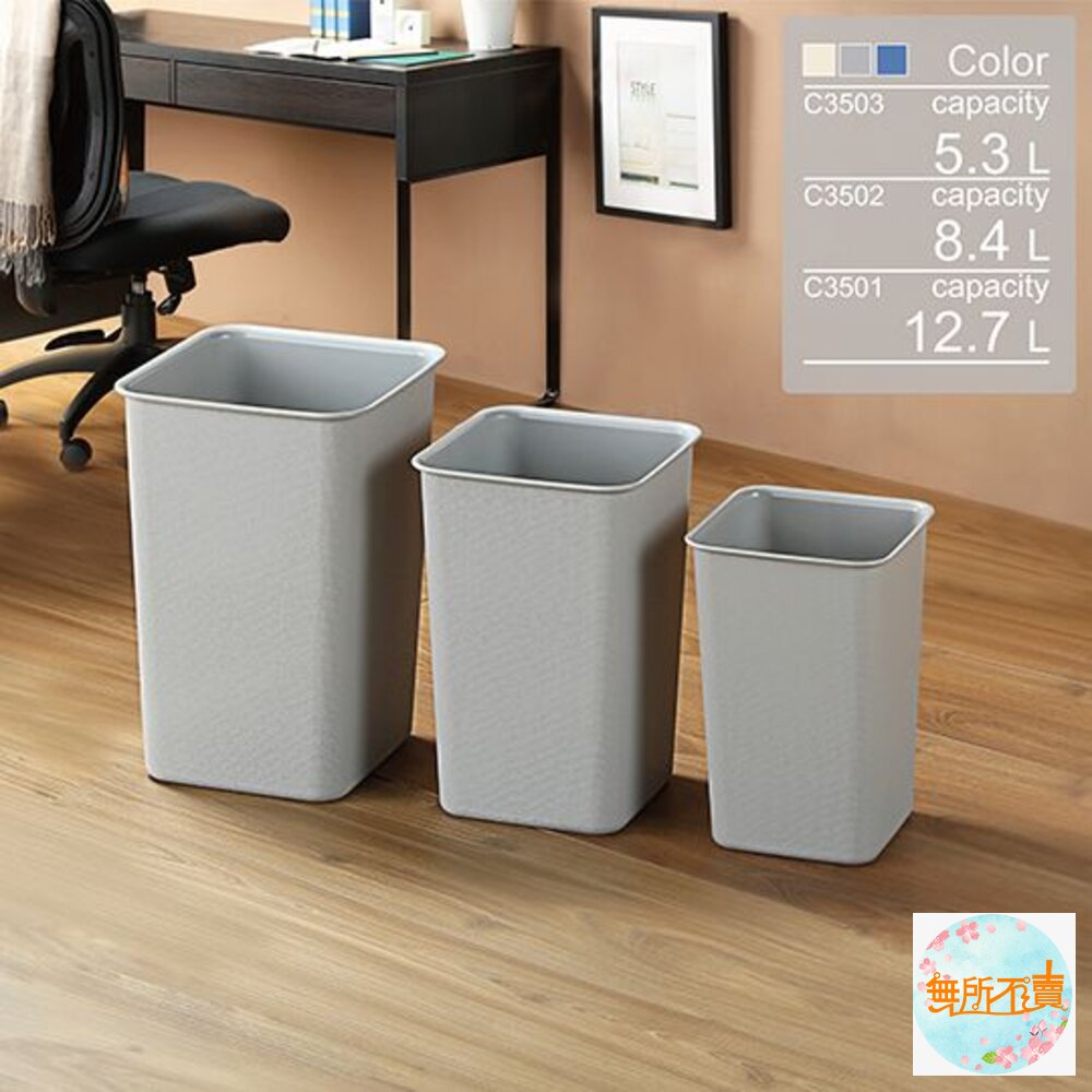 C3503 小方型京都垃圾桶 產品編號:C3503 尺寸:177x177x239mm 容量:5.3 Liters 產品特色 簡便丟垃圾,方型設計,表面作仿針織紋處理,有三種尺寸之產品,可供挑選;低調灰、沉穩藍,任君選擇。
