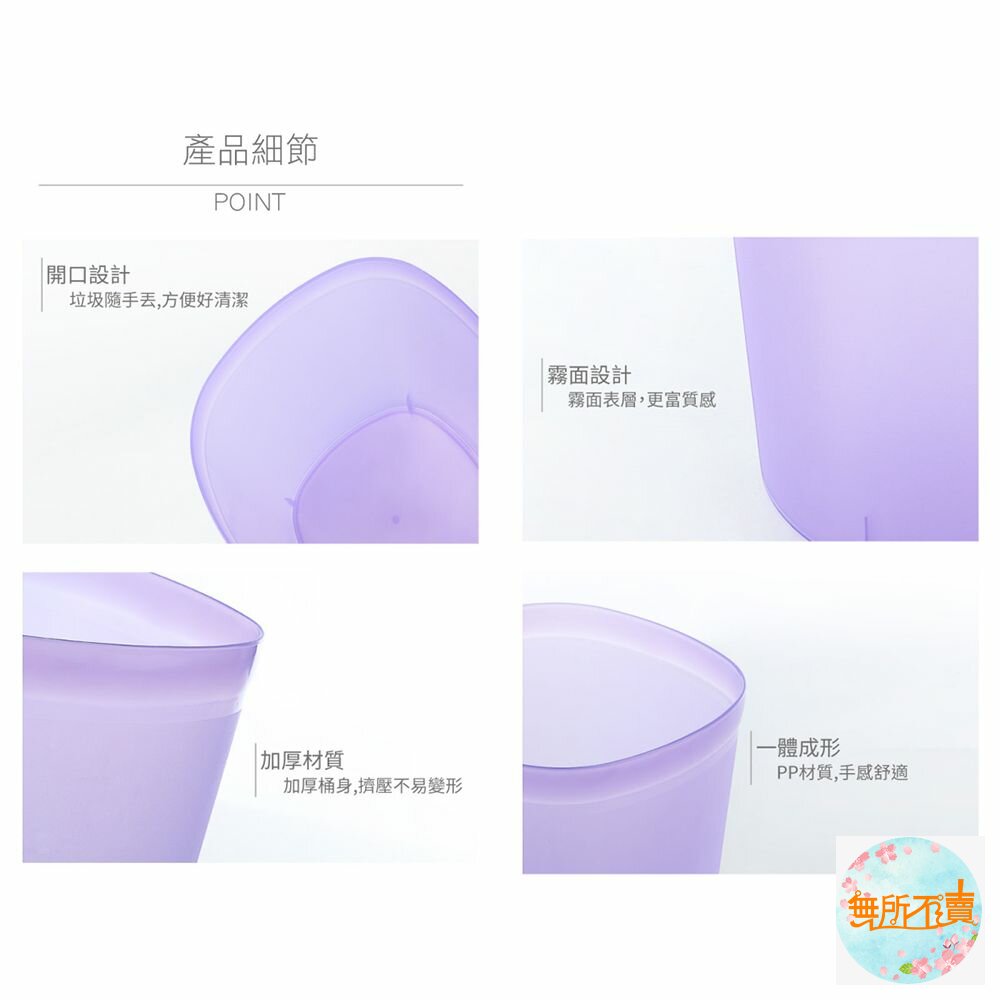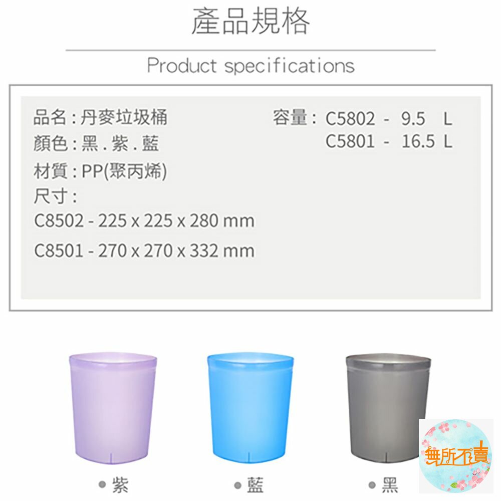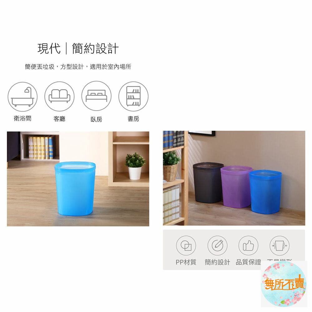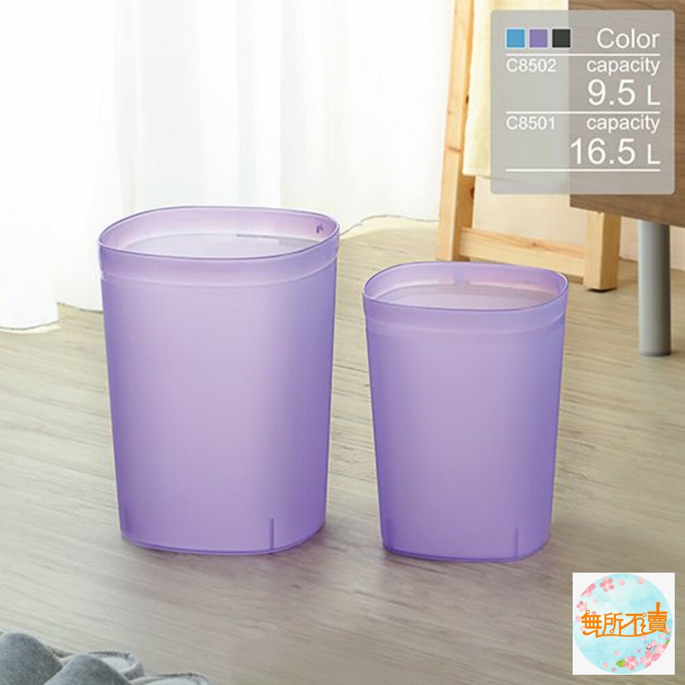 C8502中丹麥垃圾桶(方型) 產品編號:C8502 尺寸:225x225x280mm 容量:9.5 Liters 產品特色 簡便丟垃圾,方型設計,霧面表層,更富質感,有兩種尺寸之產品,可供選擇;自由水藍、低調黑、優雅紫,任君挑選。