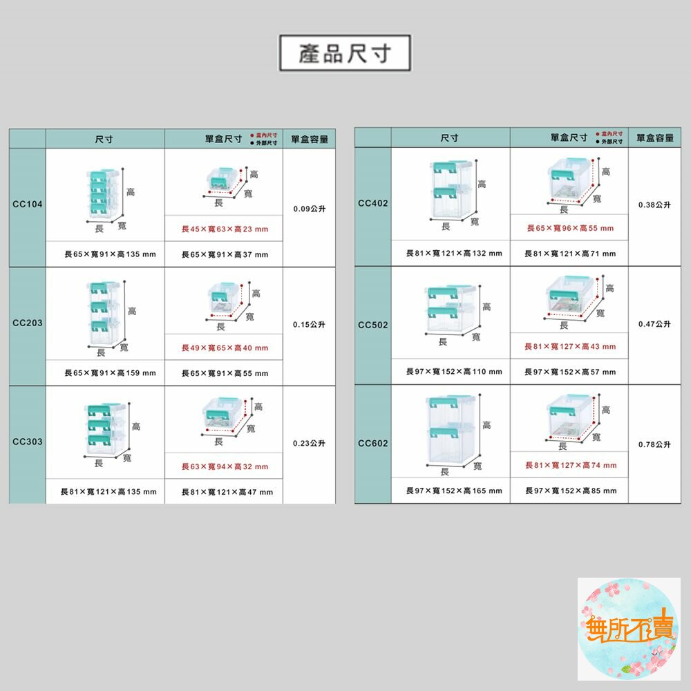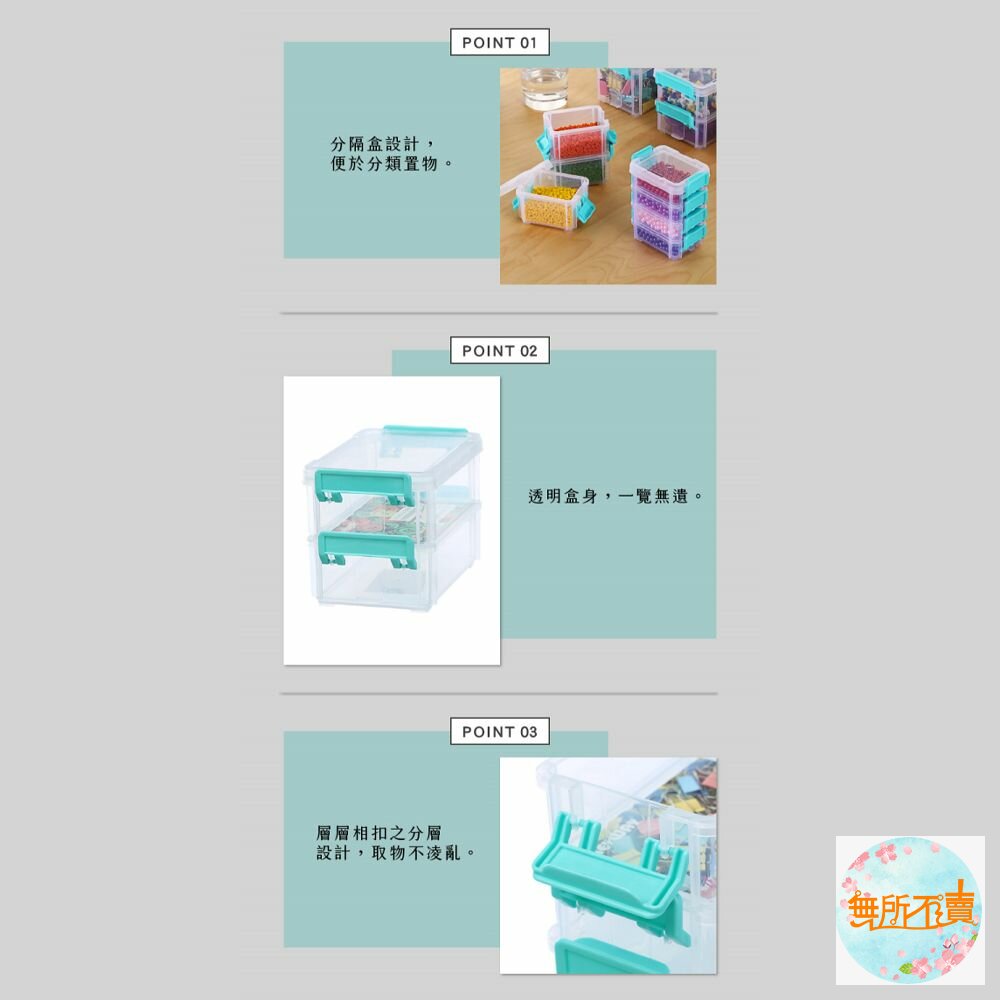 透明盒身,一覽無遺,分隔盒設計,便於分類置物,層層相扣之分層設計,取物不凌亂,適用於文具、髮飾、零件等各式小物收納;有六種尺寸,可供選擇。