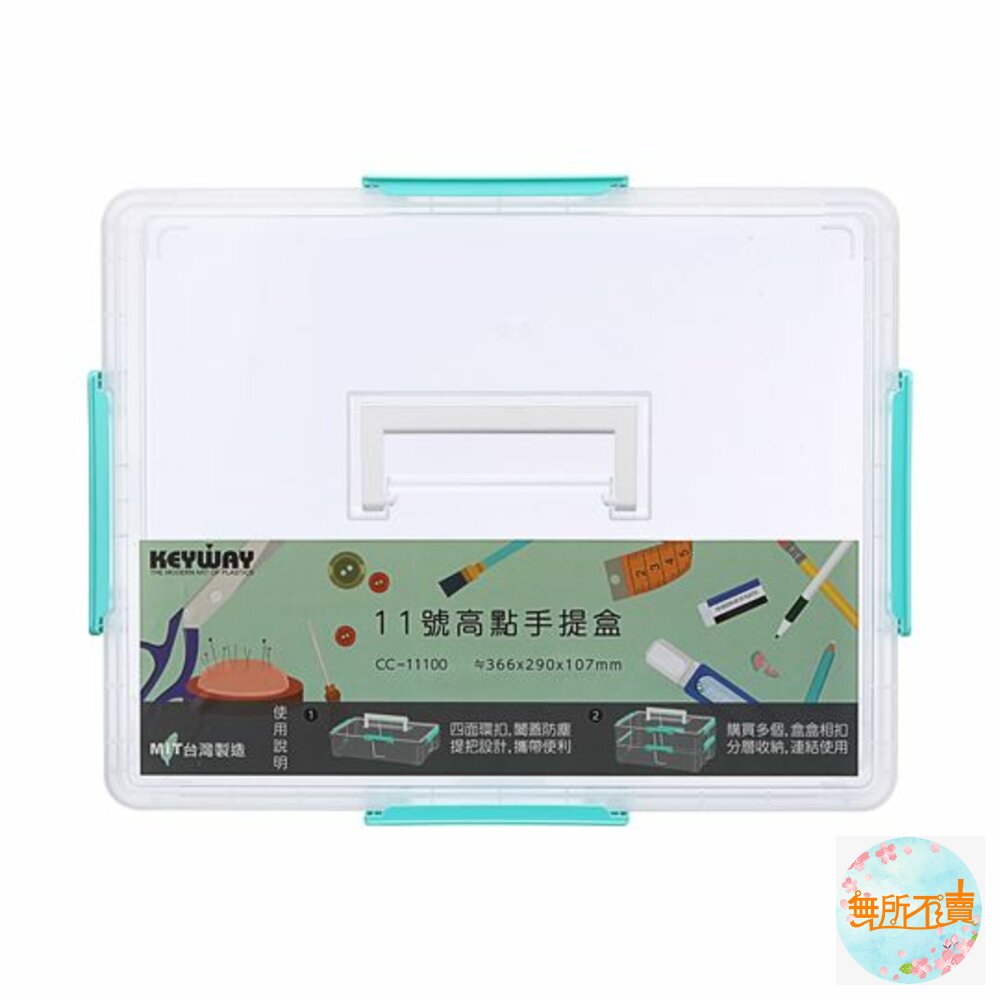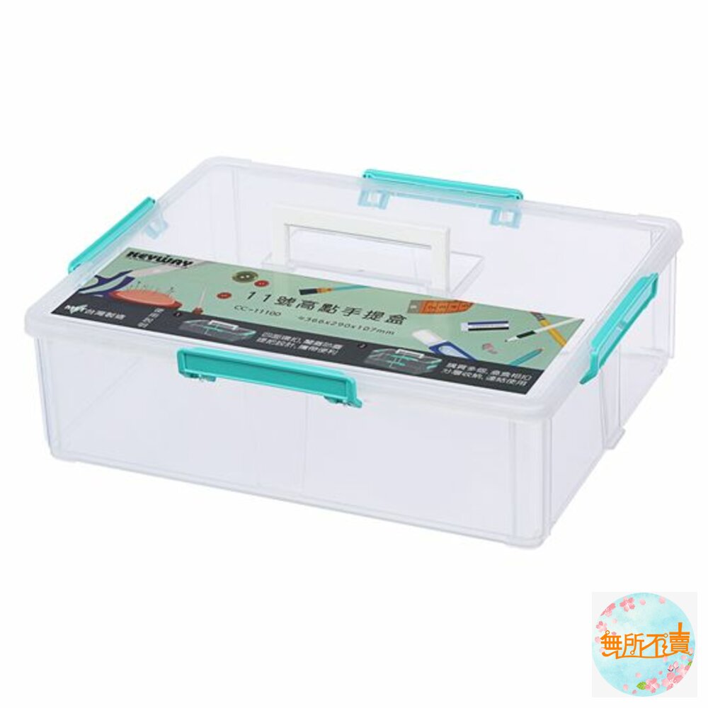 超取限1個!超取限1個 CC11100 11號高點手提盒 產品編號:CC-11100 尺寸:366x290x107mm 產品特色 透明盒身,一覽無遺,四面環扣,闔蓋防塵,提把設計,攜帶便利;購買多個可作盒盒相扣,分層連結設計,取物不凌亂;適用文書用品等各式小物收納。