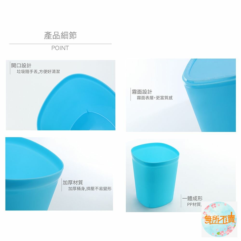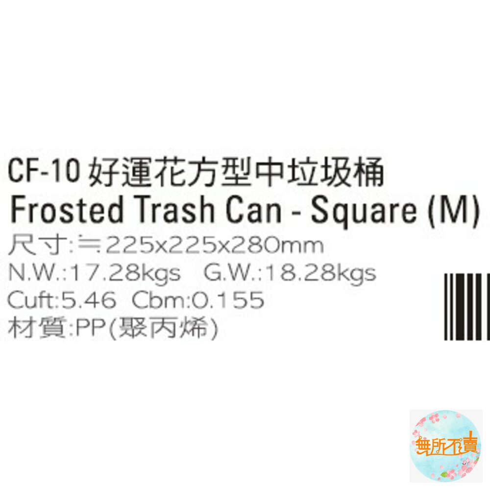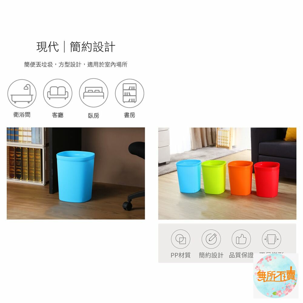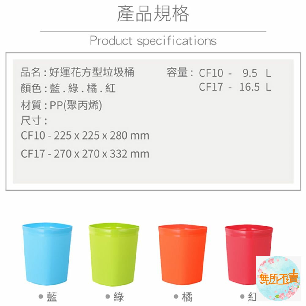 CF-10 好運花方型中垃圾桶 產品編號:CF10 尺寸:225x225x280mm 容量:9.5 Liters 產品特色 簡便丟垃圾,方型設計,霧面表層,更富質感;有兩種尺寸之產品,可供挑選,活力淺綠、自由水藍、溫暖橘、熱情紅,任君選擇。