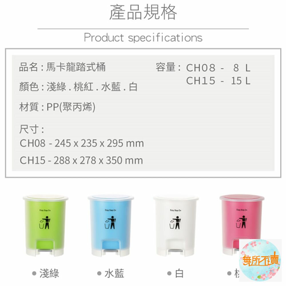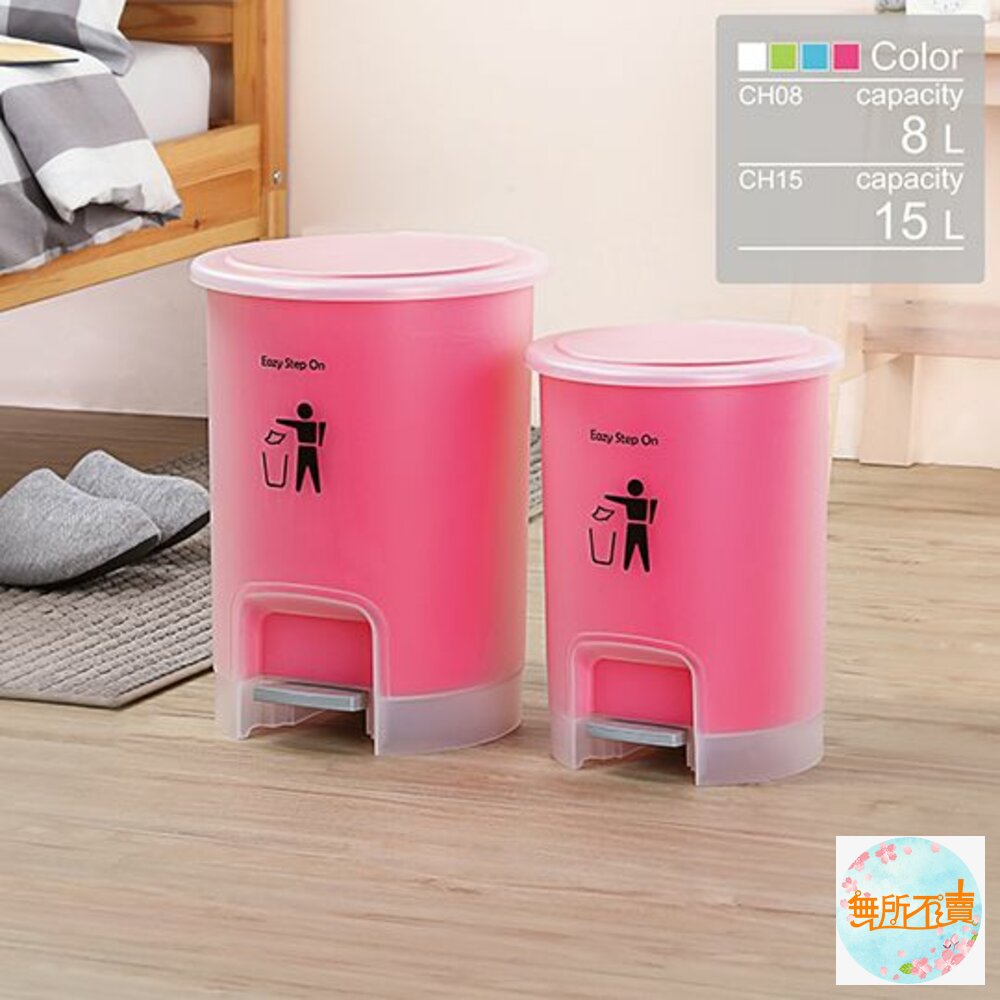 ★★★超取限1個 CH-08 馬卡龍踏式桶8L 產品編號:CH08 尺寸:245x235x295mm 產品特色 馬卡龍色調,圓型霧面踏式設計,細菌污漬不沾手,雙層設計,內層提桶可拿起,方便倒垃圾,有兩種尺寸,可供選擇,活力淺綠、甜美桃紅、自由水藍、皎潔白,可供挑選。