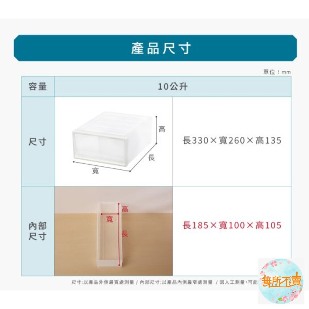 超取限購1個,若要多買請拆單 PP(聚丙烯) 產品顏色 透明 產品特色 霧面透明,精美外框設計。手把設計:便於拉取。防滑落設計:防抽屜掉落。活動式分隔設計:內附2長4短的隔板,可自行組裝,分類置物。附連結扣:箱體連結堆疊更穩固