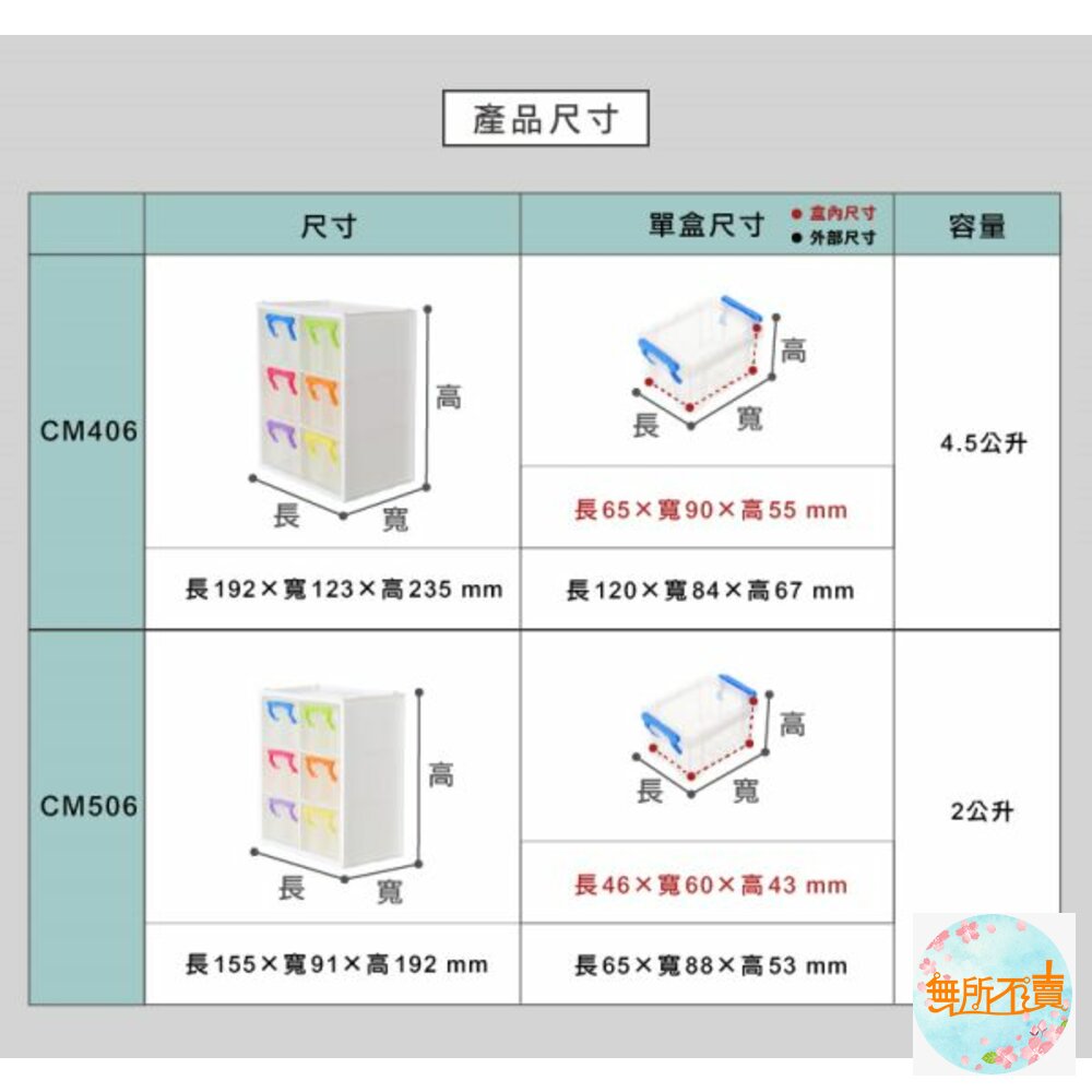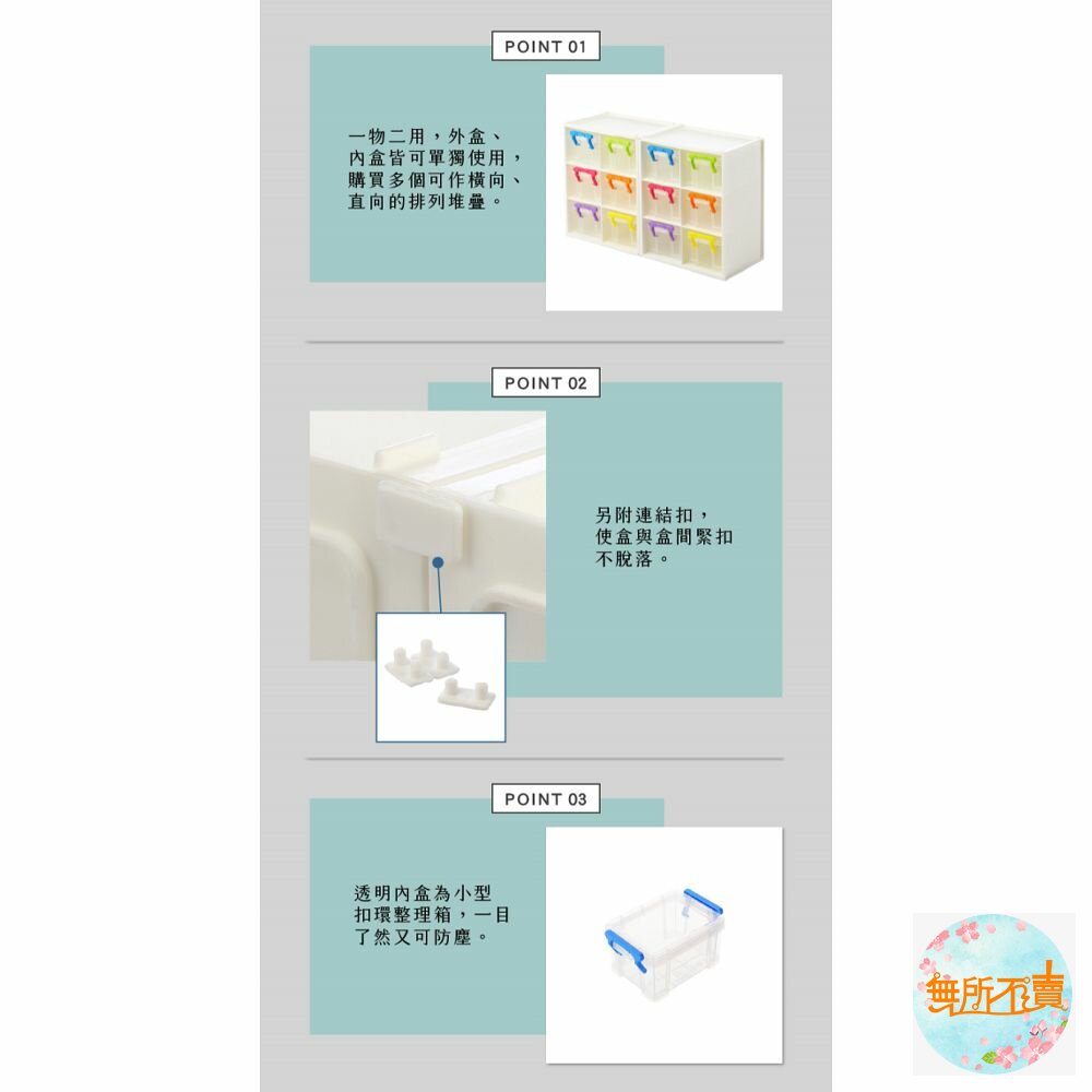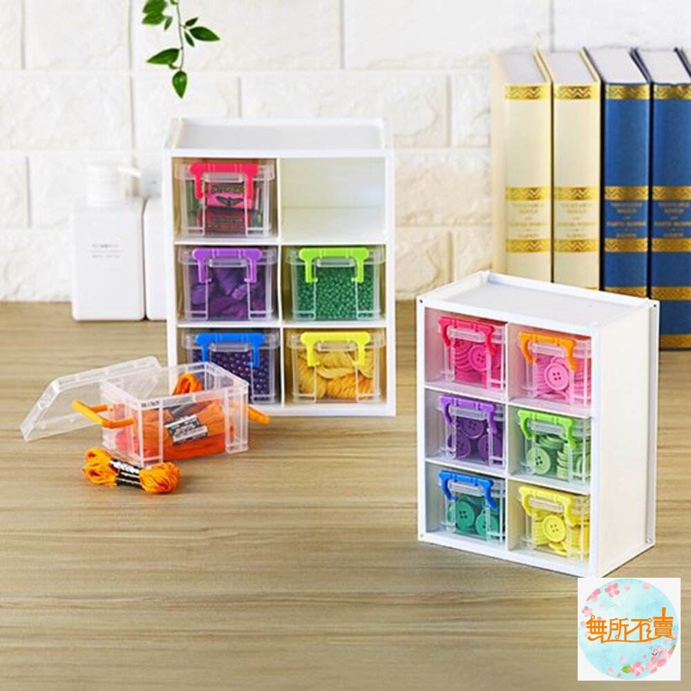 一物二用,外盒、內盒皆可單獨使用,購買多個可作橫向、直向的排列堆疊,另附連結扣,使盒與盒間緊扣不脫落,透明內盒為小型扣環整理箱,一目了然又可防塵;適用於文具、藥品、髮飾、零件等各式小物,有小(CM506)、中(CM406)之產品,可供選擇。