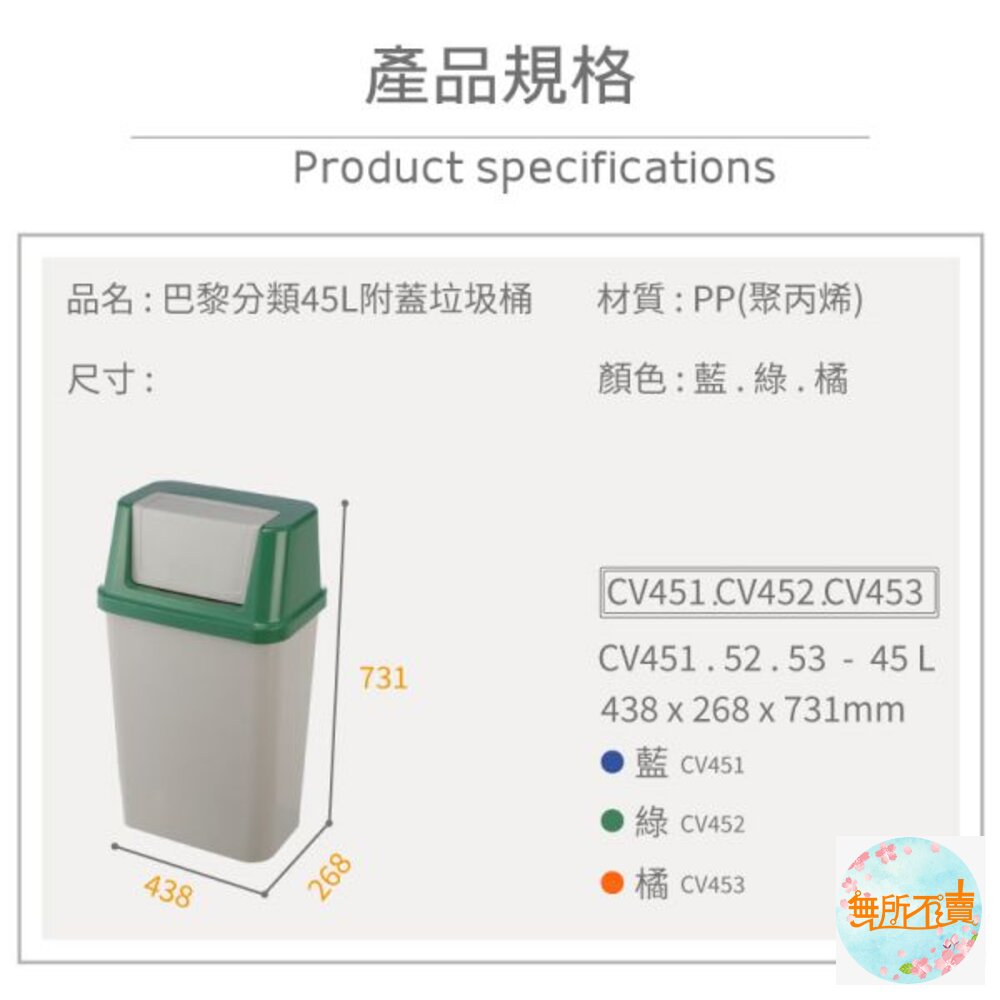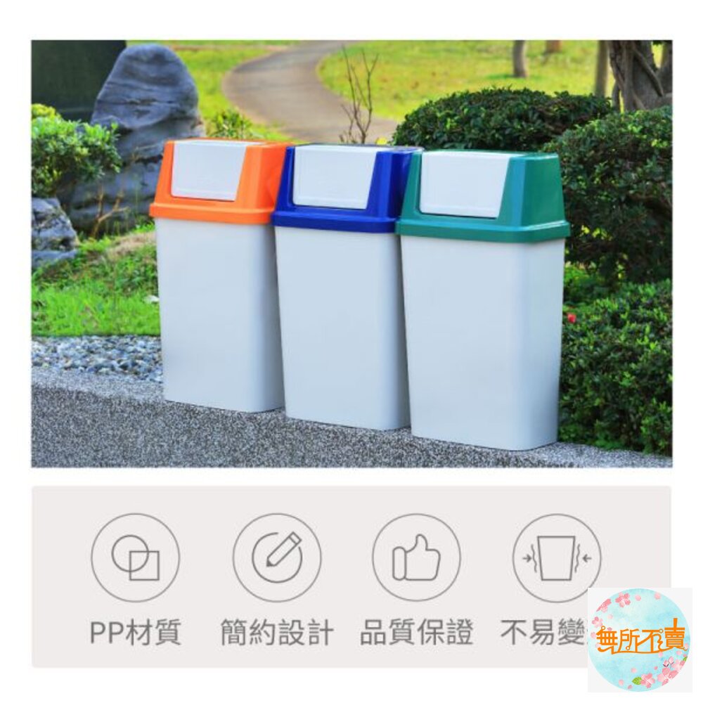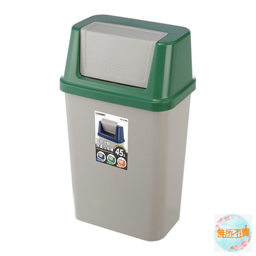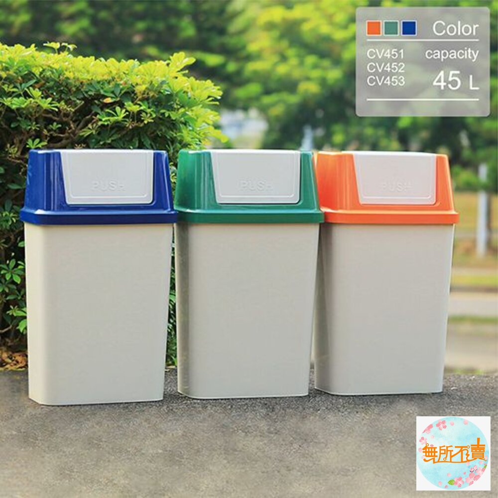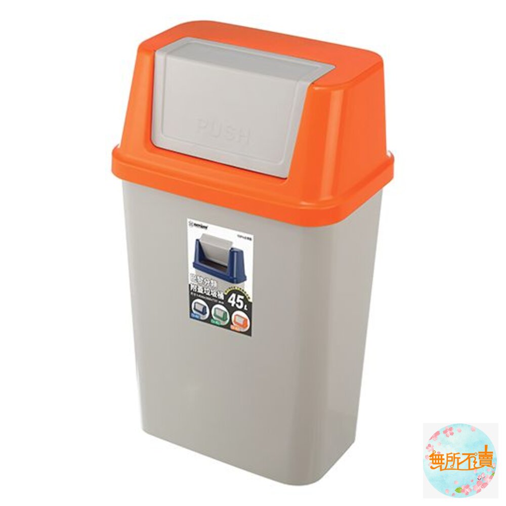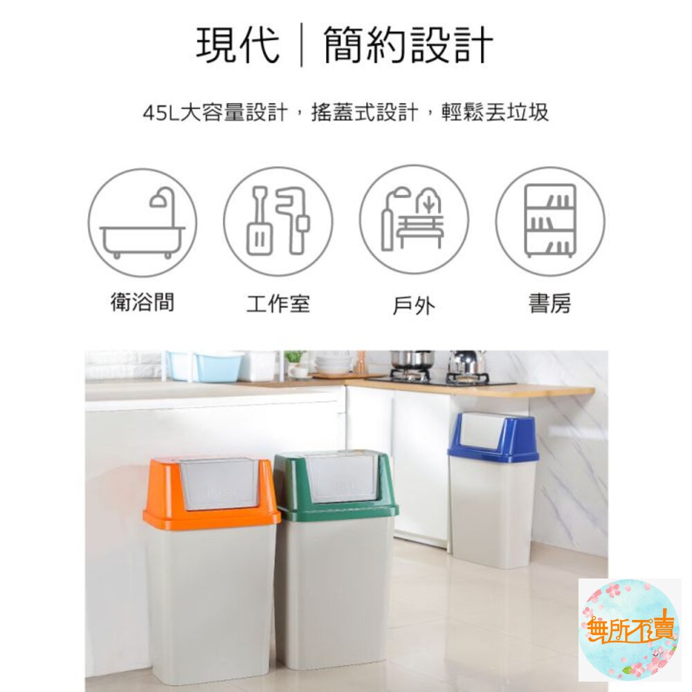 45L大容量設計,橘.藍.綠色系,襯出活潑之感,長方型亮面,光滑俐落,搖蓋式設計,可阻隔異味,輕鬆丟垃圾。