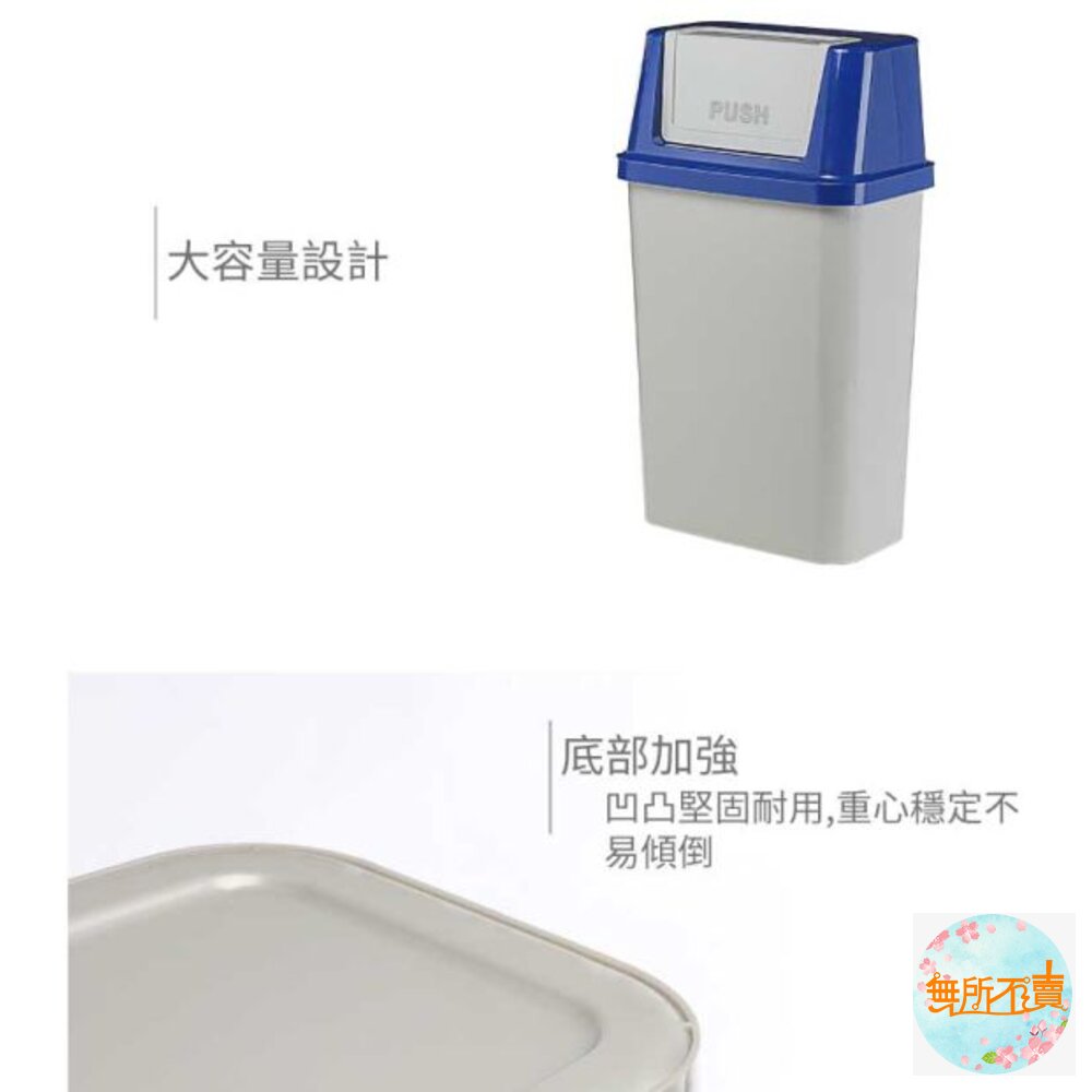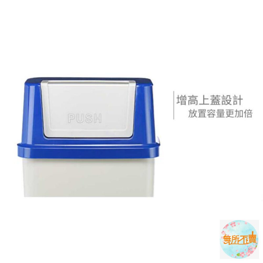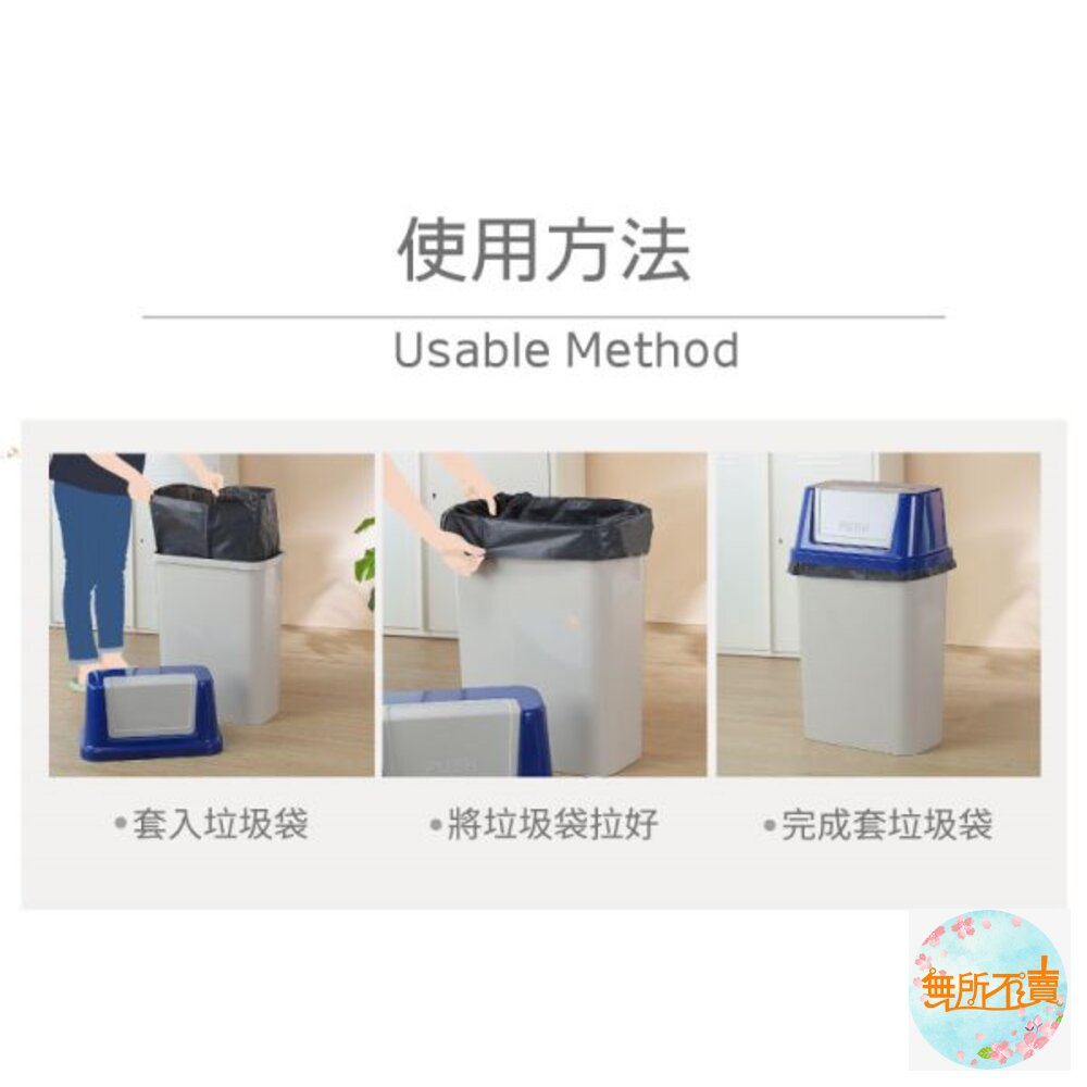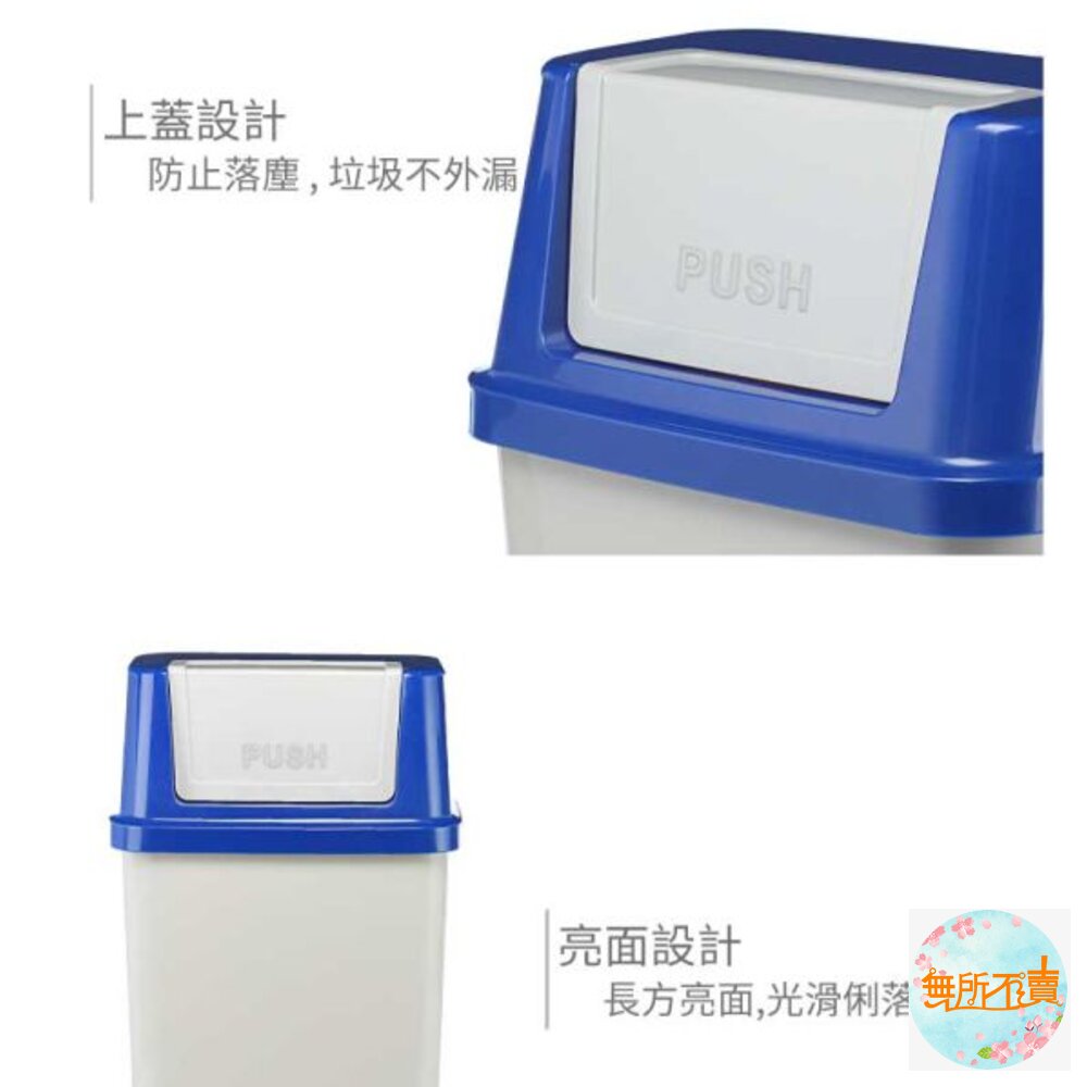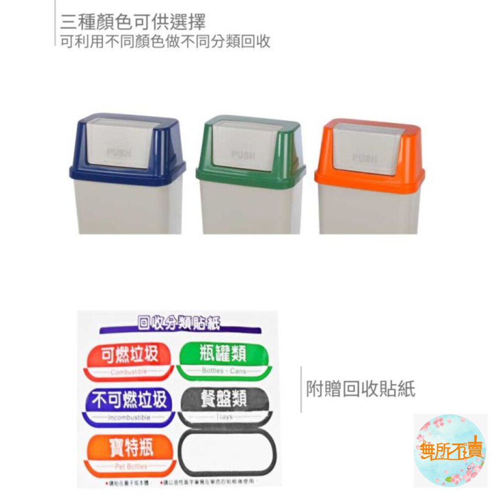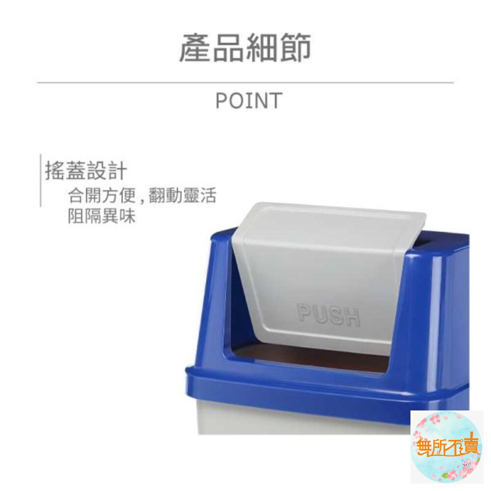 45L大容量設計,橘.藍.綠色系,襯出活潑之感,長方型亮面,光滑俐落,搖蓋式設計,可阻隔異味,輕鬆丟垃圾。
