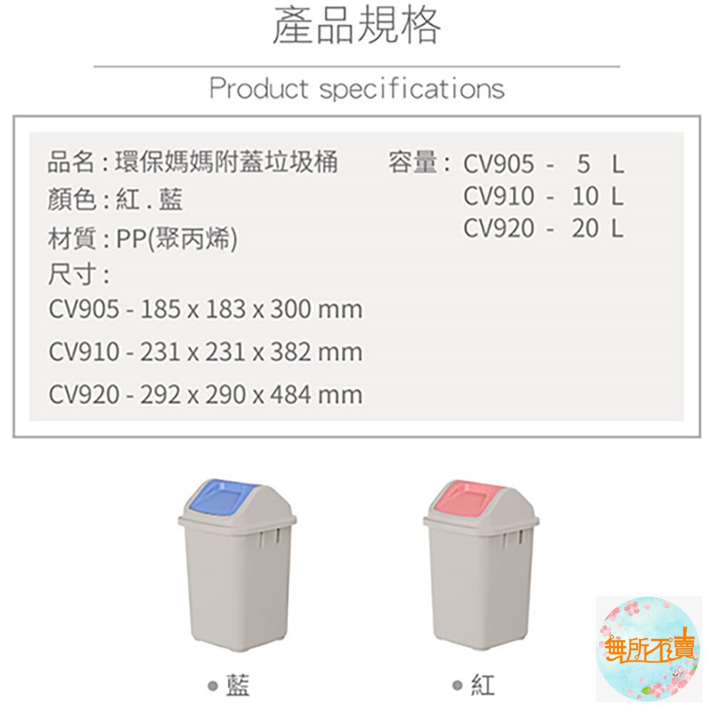CV-910 環保媽媽10L附蓋垃圾桶 產品編號:CV910 尺寸:231x231x383mm 產品特色 方型霧面搖蓋式設計,可阻隔異味,適用於居家或辦公室;有三種尺寸,可供選擇,兩種顏色,可供挑選。 *此款垃圾桶,使用超商取貨時,一筆訂單限購2個 ,超過數量請另外再下單,謝謝