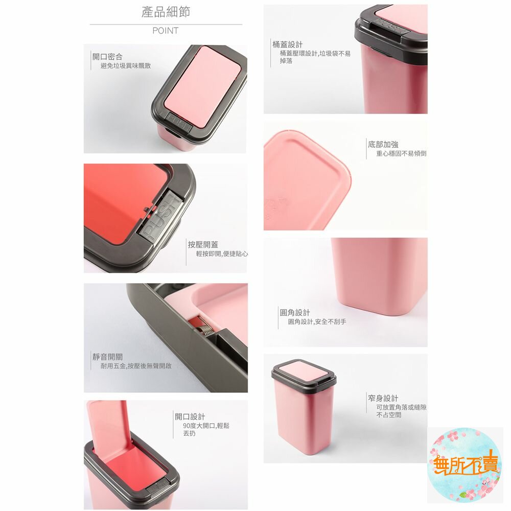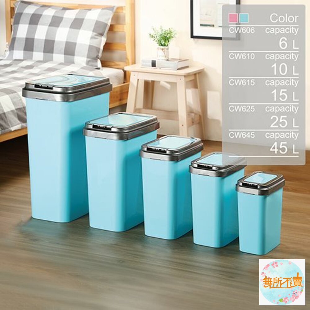 ※超取限購2個 CW-606 可潔押式垃圾桶(6L) 產品編號:CW606 尺寸:237x147x274mm 產品特色 長型亮面設計,光滑俐落,按壓式開啟設計,蓋內卡榫,可固定桶蓋,使之不易脫落;有五種尺寸,可供挑選,優雅淺藍、浪漫粉紅色,可供選擇。