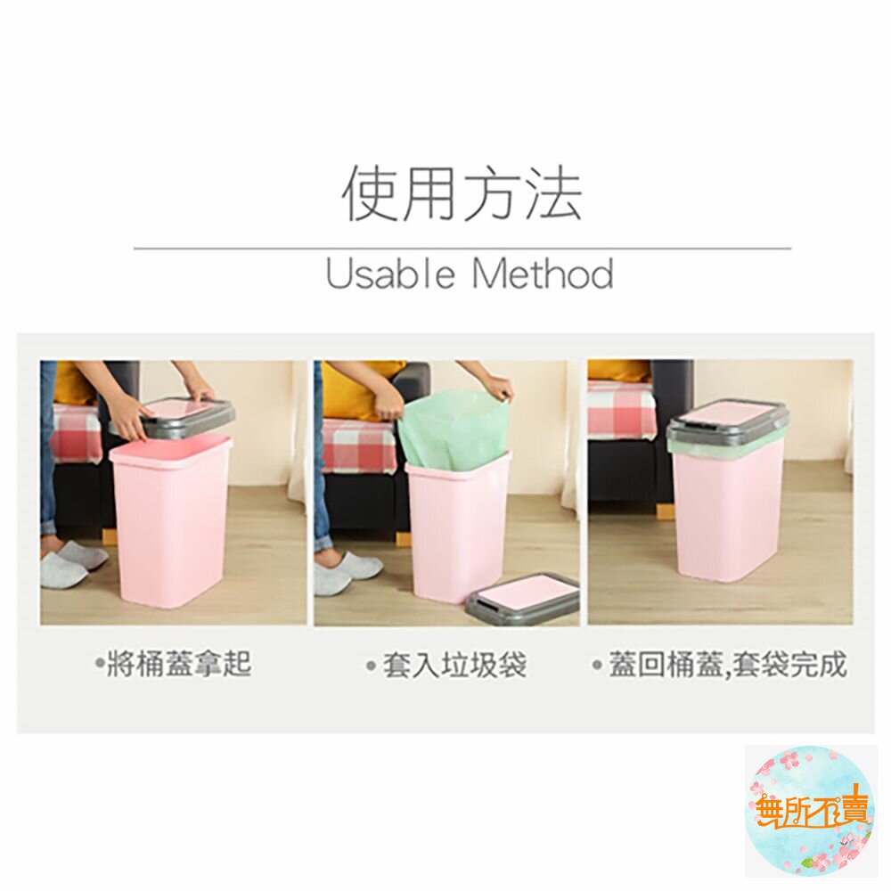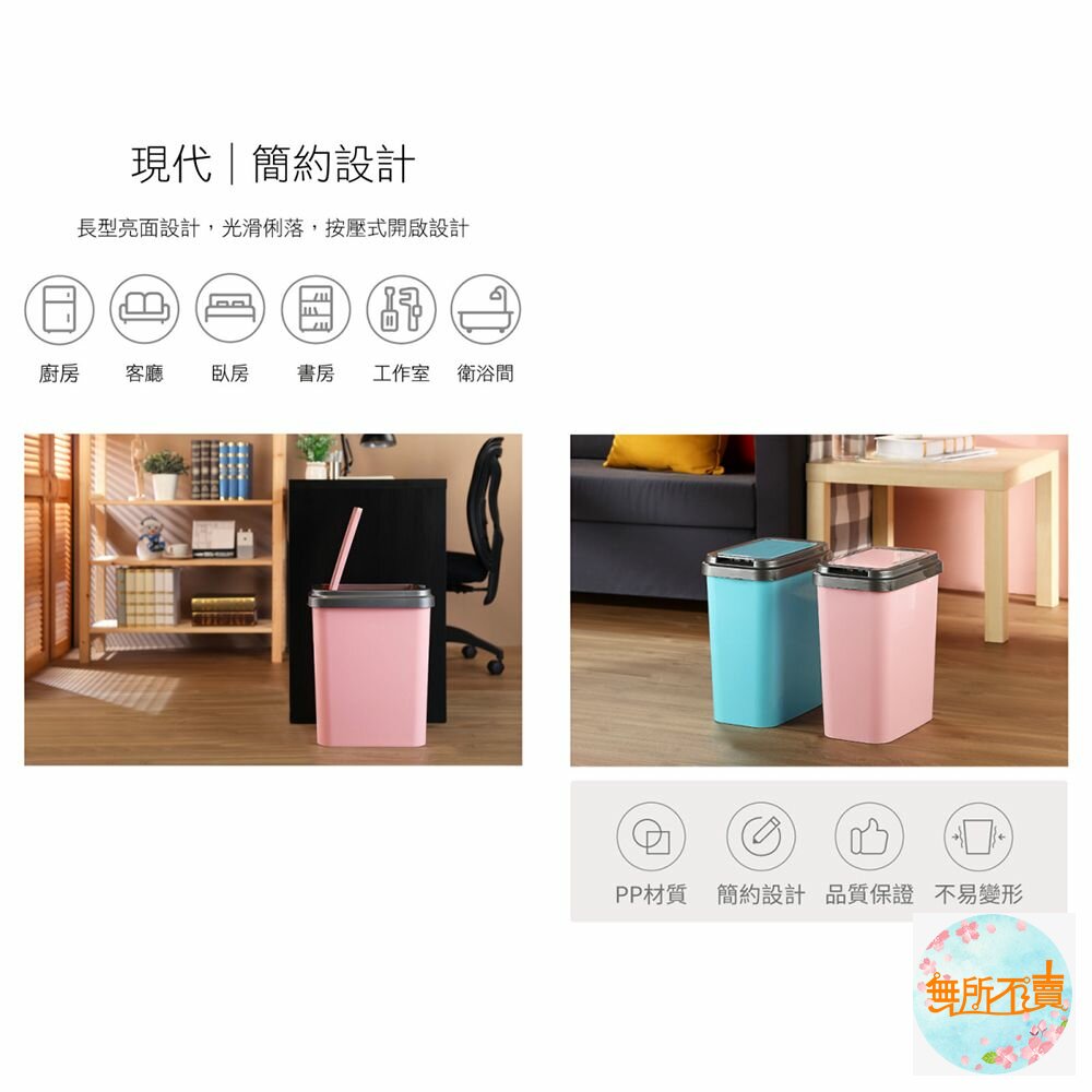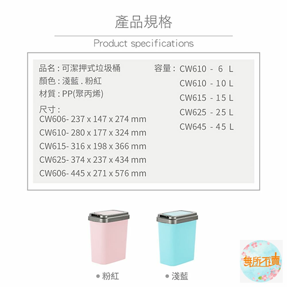※超取限購1個 CW-610 可潔押式垃圾桶(10L) 產品編號:CW610 尺寸:280x177x324mm 產品特色 長型亮面設計,光滑俐落,按壓式開啟設計,蓋內卡榫,可固定桶蓋,使之不易脫落;有五種尺寸,可供挑選,優雅淺藍、浪漫粉紅色,可供選擇。