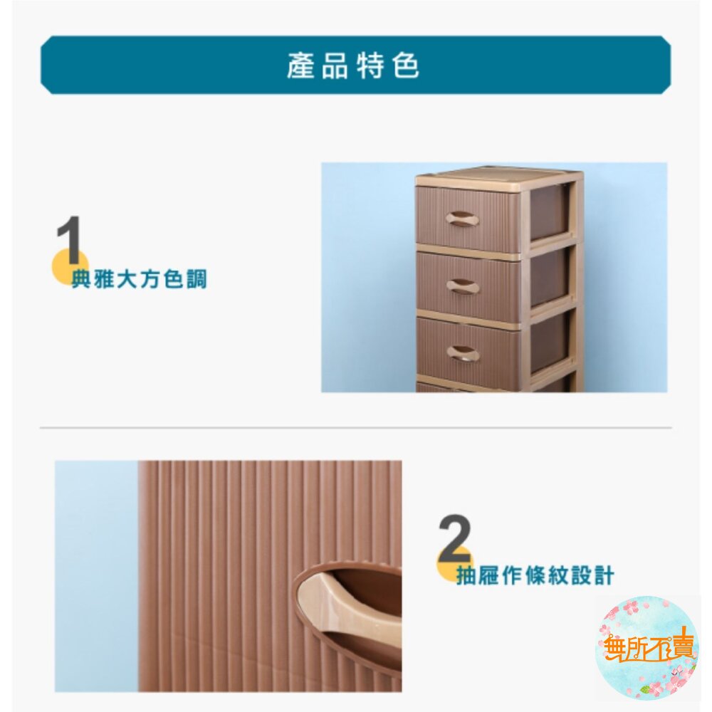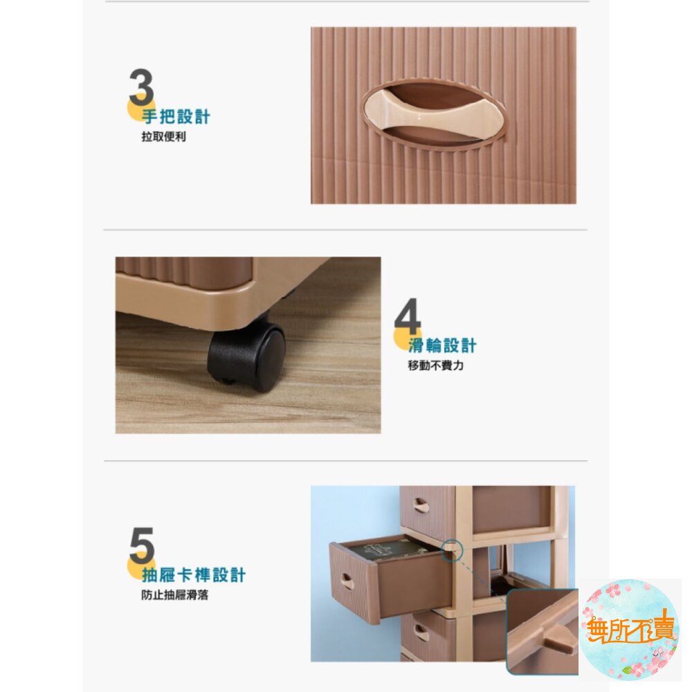 底部滑輪設計,更方便移動,可組可拆,典雅大方色調,抽屜作條紋設計;手把設計,便於拉取,抽屜內卡榫設計,可防止抽屜掉落,有三層、四層、五層之產品,可供選擇。