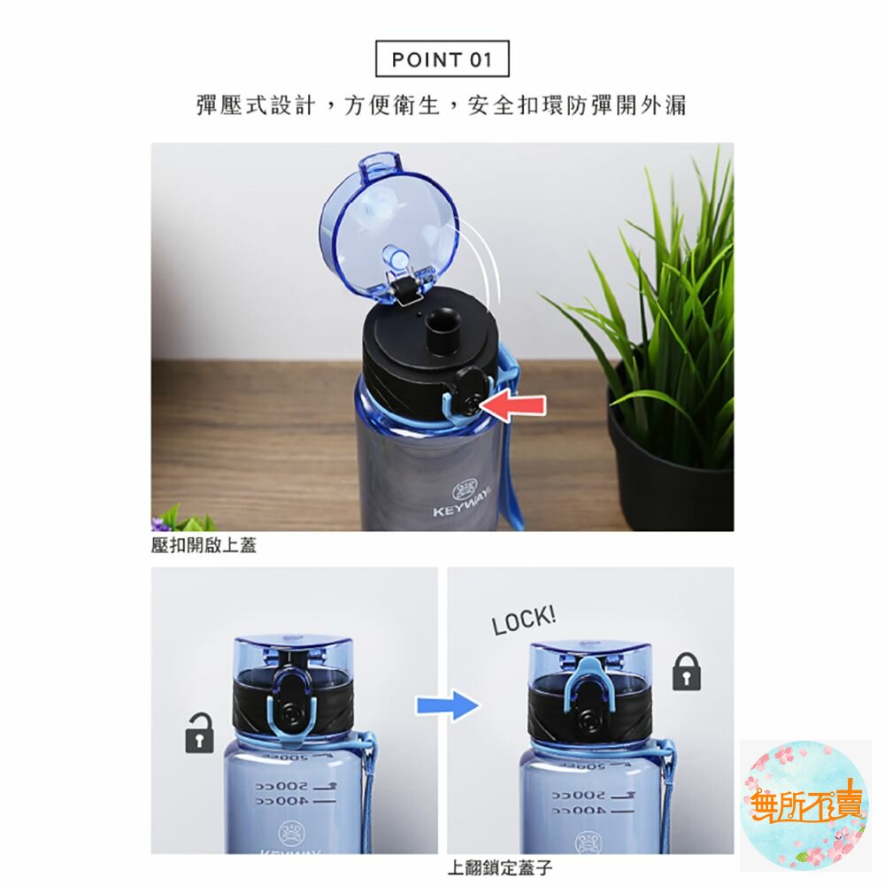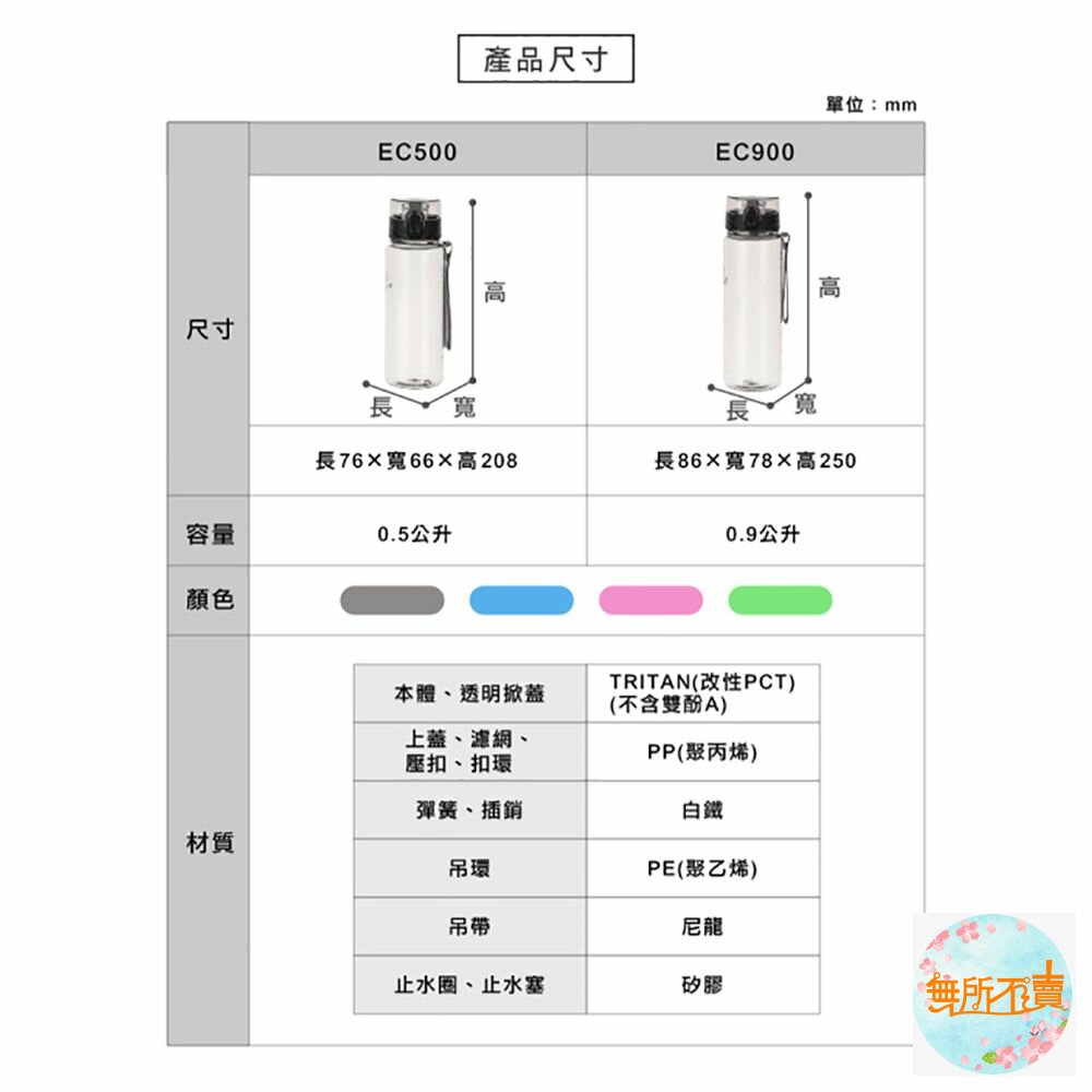 EC-900 清水站900CC水壺 產品編號:EC900 尺寸:86x78x250mm 產品特色 彈壓式設計,方便衛生,附過濾網,可調節水流,防止水流過大嗆到口鼻,蓋內的止水圈及止水塞,防滲漏更密封; 提帶設計攜帶便利,安全扣環防彈開外漏,有容量刻度,可作測量,有四種顏色,任君挑選,耐溫-20度C~+100度C。