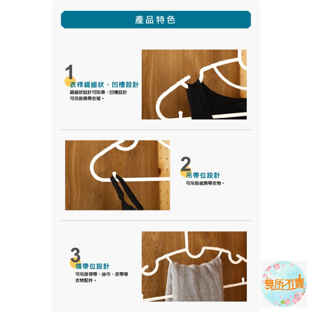 F-360劍橋全功能衣架(10入) 產品編號:F360 尺寸:410x7x206mm 產品特色 多用途衣架,皎潔淨白色調,衣桿鋸齒狀設計可防滑,貼心的領帶位、吊帶位、凹槽之設計,可吊掛領帶、絲巾、皮帶、細肩帶衣裙等,更便利使用。