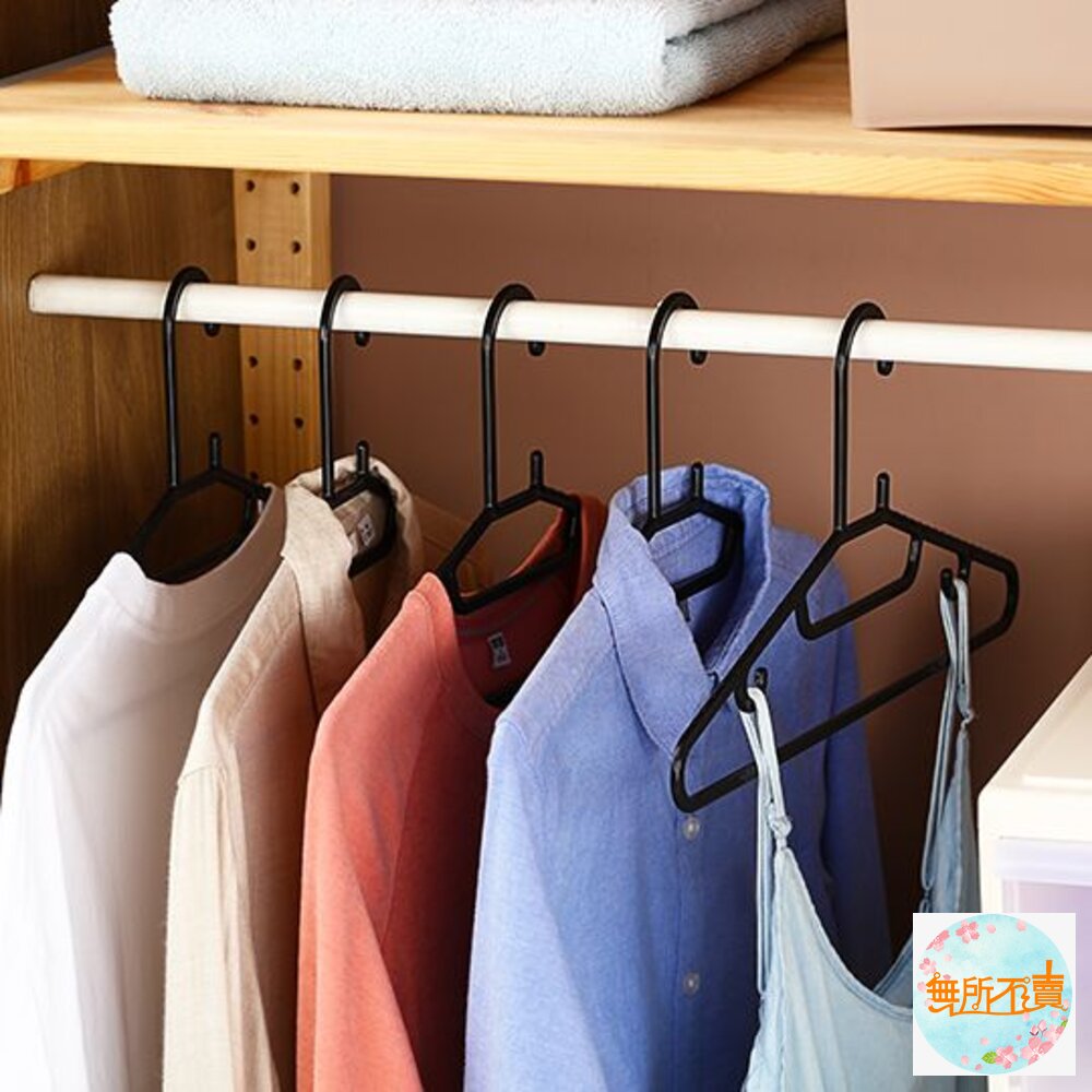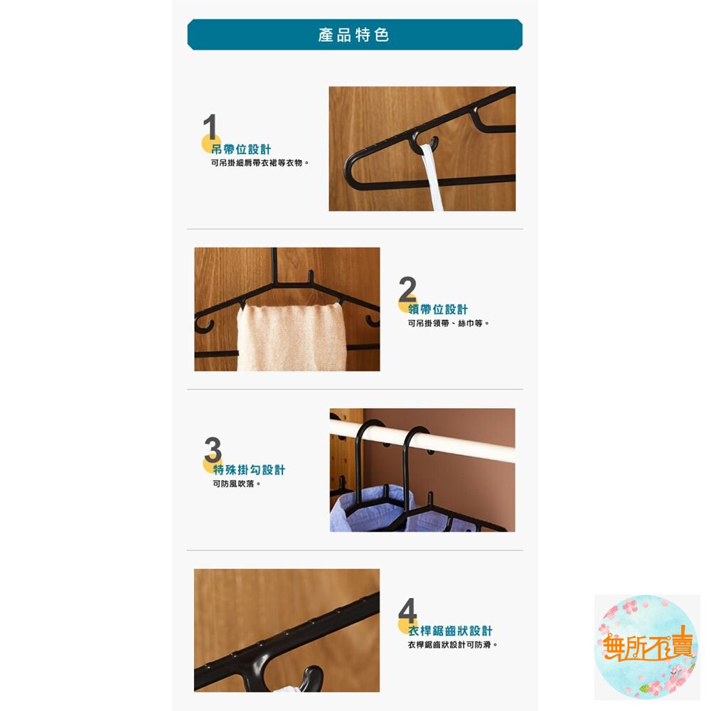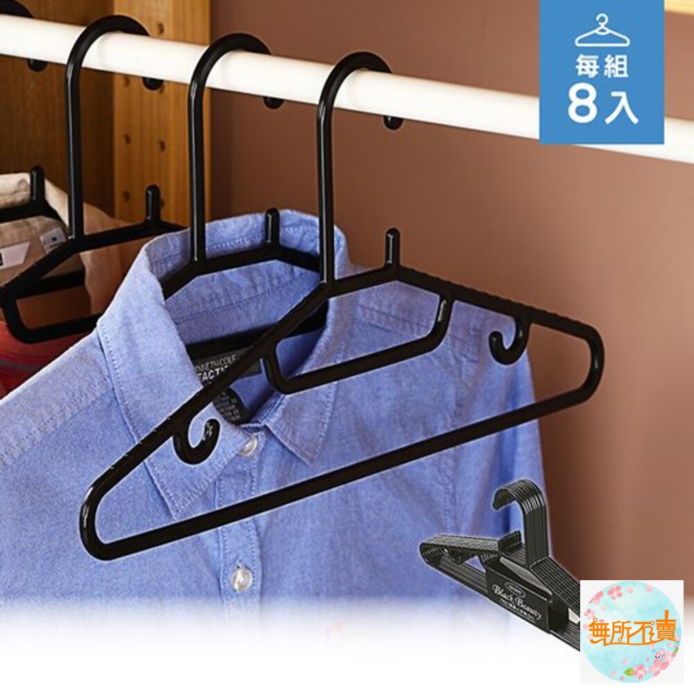 超商最多兩組 F625 黑美人衣架(8入) 產品編號: F625 尺寸:408x5x200mm 產品特色 低調時尚的黑色色調,衣桿鋸齒狀設計可防滑,特殊掛勾設計,可防風吹落,貼心的領帶位、吊帶位之設計,可吊掛領帶、絲巾、皮帶、細肩帶衣裙等。
