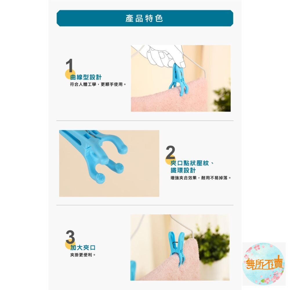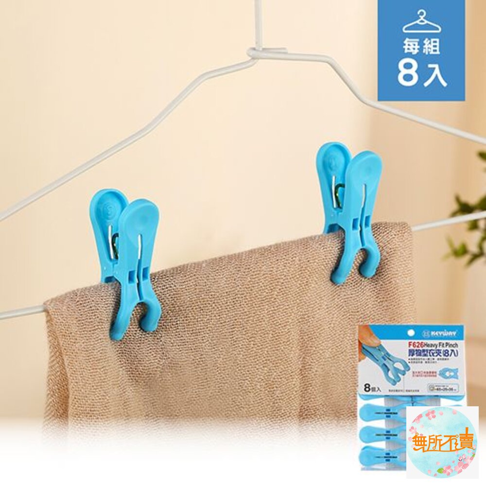 F626厚物型衣夾(8入) 產品編號:F626 尺寸:65x25x35mm 產品特色 曲線型設計,符合人體工學,更順手使用;夾口點狀壓紋、鐵環設計,增強夾合效果,耐用不易掉落,加大夾口,夾掛更便利,使用A級塑材,不易脆化。