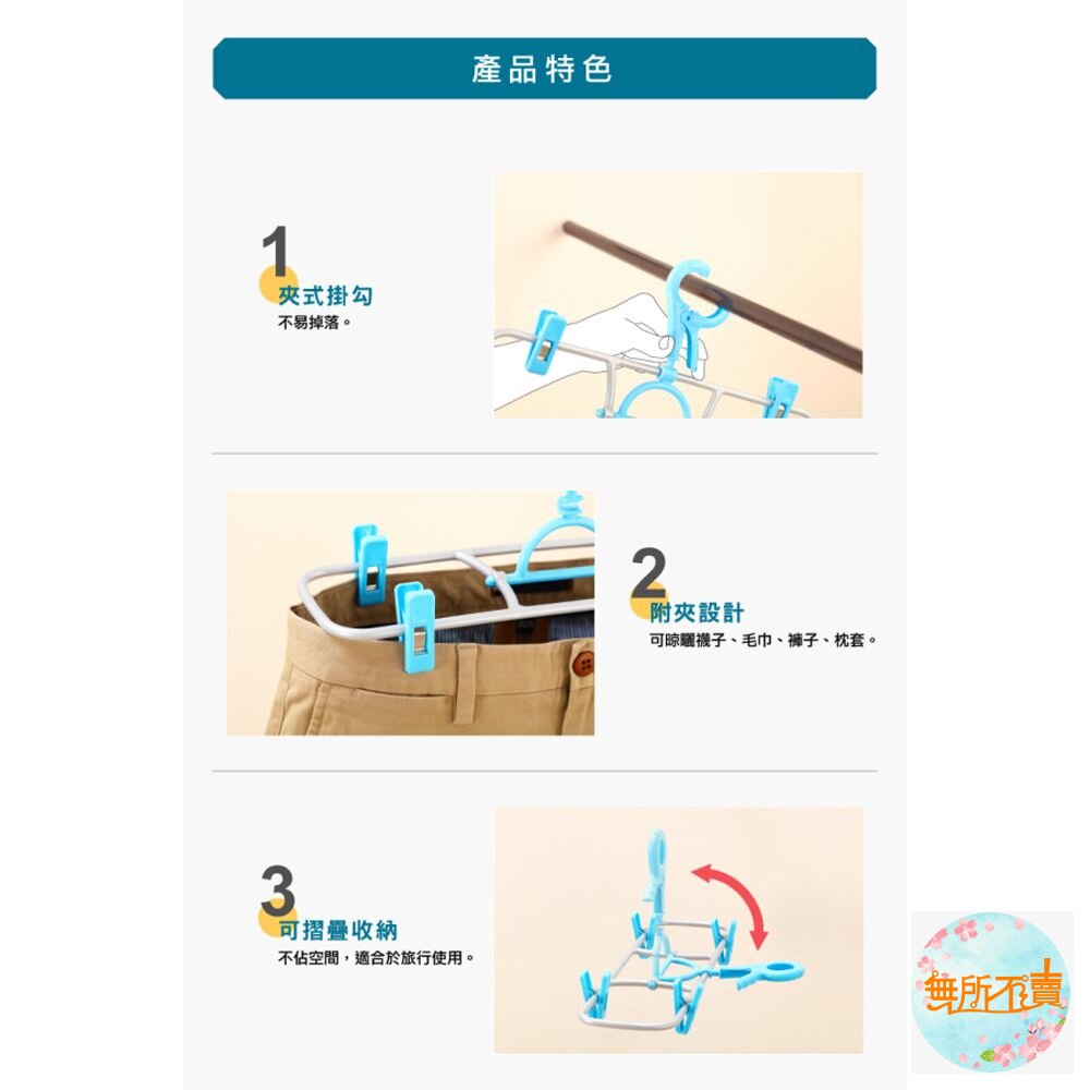 夾式掛勾,不易掉落,曲線型設計,符合人體工學,更順手使用,可摺疊收納,不佔空間,適合於旅行使用,附夾設計,可晾曬襪子、毛巾、褲子、枕套等,更通風透氣;有自由水藍、溫暖橘、活力綠。