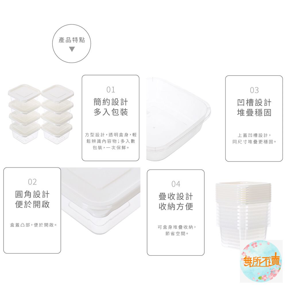 淨白無瑕色調,長型設計,可冷藏、可放入洗碗機清洗、可將盒蓋拿起微波;盒蓋凸部,便於打開,可相互層層疊放,有各式容量的產品,可供選擇,亦可堆疊收納,節省空間;耐溫-20度C至100度C。