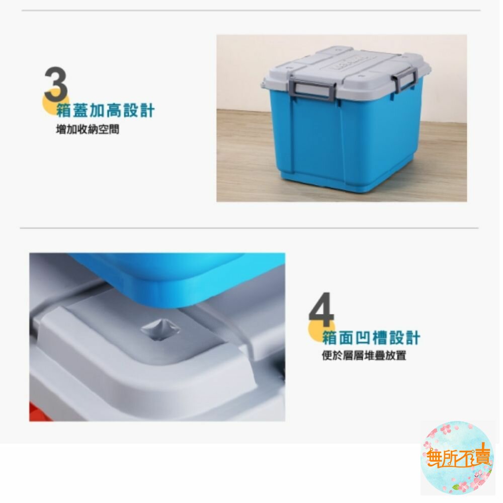 結構加強更結實,四面扣環設計,闔蓋防塵,底部滑輪設計,可拆裝變換方向,移動更加便利,兩邊洞孔設計,可搭配束帶,防箱蓋打開;可作堆疊,節省空間,箱面凹槽,使堆疊更穩固,有兩種容量,可供挑選。