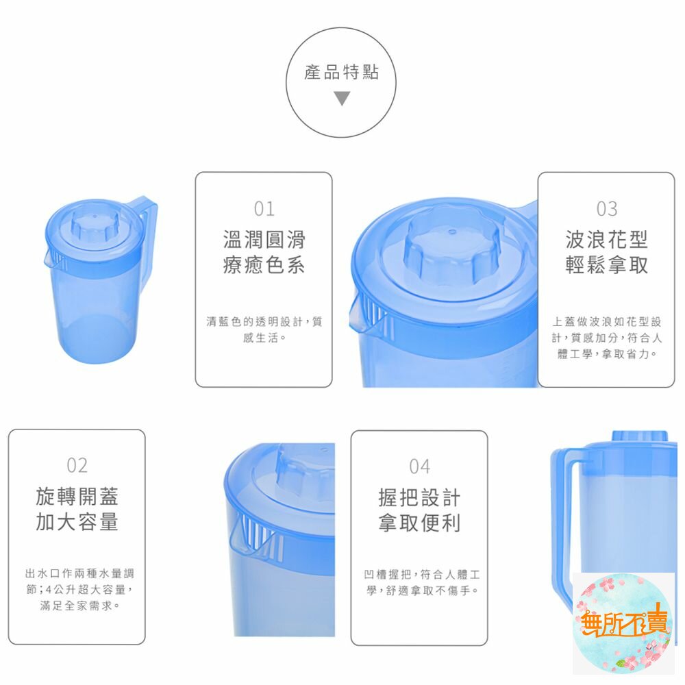 K058美樂冷水壺(4L) 產品編號:K058 尺寸:160x160x280mm 產品特色 圓型設計,湛藍青天,水天一色,有容量刻度,可作測量,可用洗碗機清洗,耐溫-20度C~+12