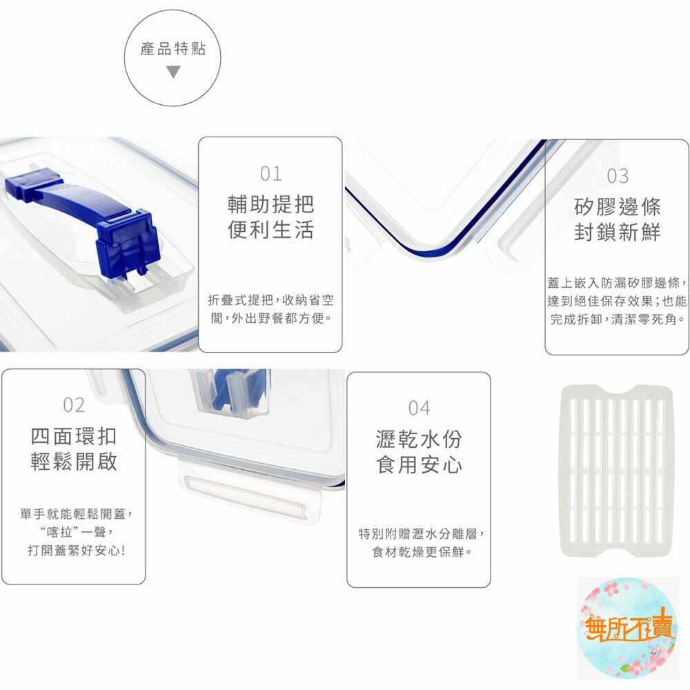 晶瑩剔透,一目了然的設計,可將盒蓋、濾網拿起微波,盒蓋提把,方便拿取;四面環扣,蓋內膠條,防滲漏更密封,附濾網,用於食材蔬果的存放,適用於外出野餐,可相互層層堆疊;有各式容量的產品,可供選擇;耐溫-20度C至110度C。
