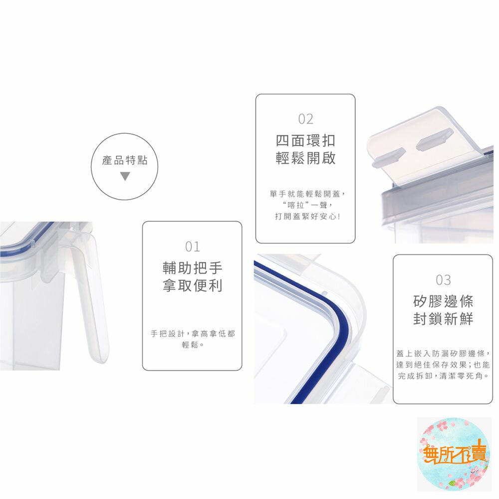 光亮剔透色系,四面環扣、蓋內膠條,防滲漏更密封,可作層層堆疊放置;把手設計,符合人體工學,好拿好施力,高處取物,輕鬆不費力。