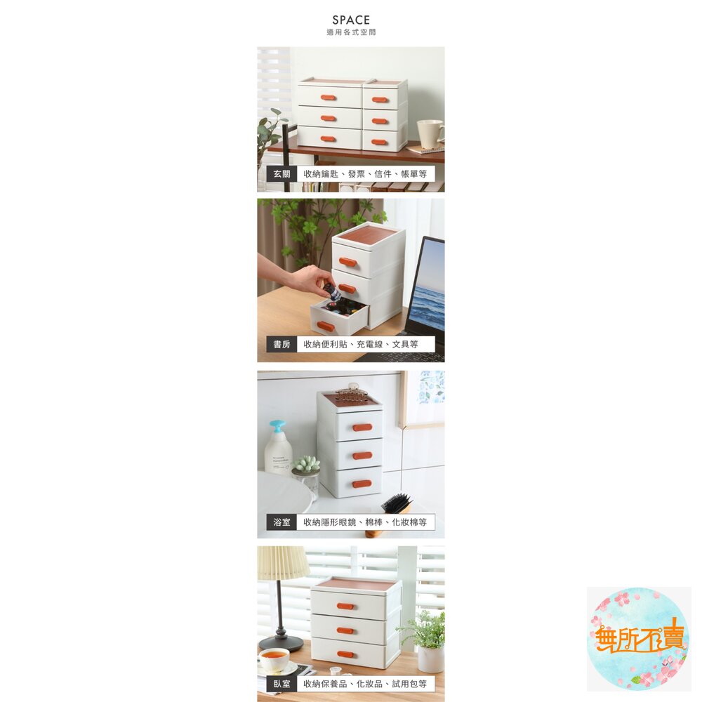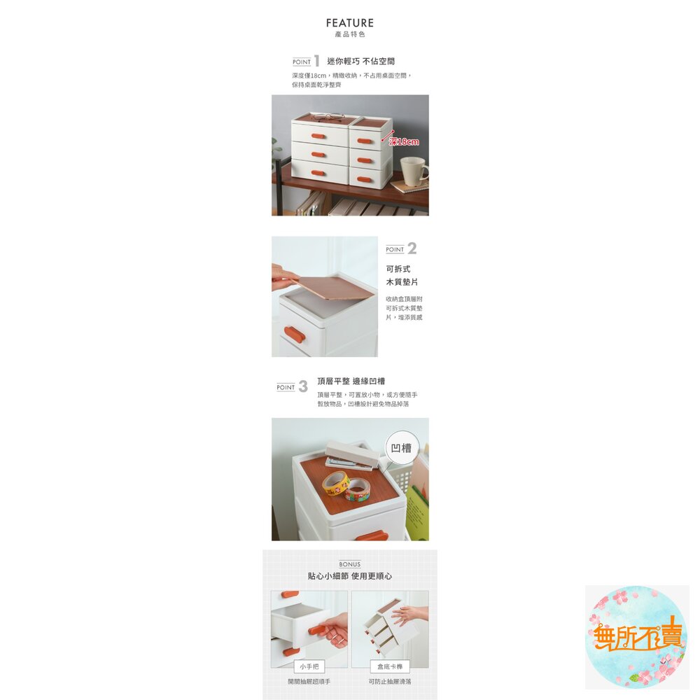 米白色主體搭配淺咖啡色手把,具高雅時尚的風格設計。收納盒的2頂層附可拆式木質墊片,增添質感。抽屜盒底卡榫設計,可防止抽屜滑落。方便桌上小物的收納整理,深度僅18cm,不佔據桌面的使用空間。