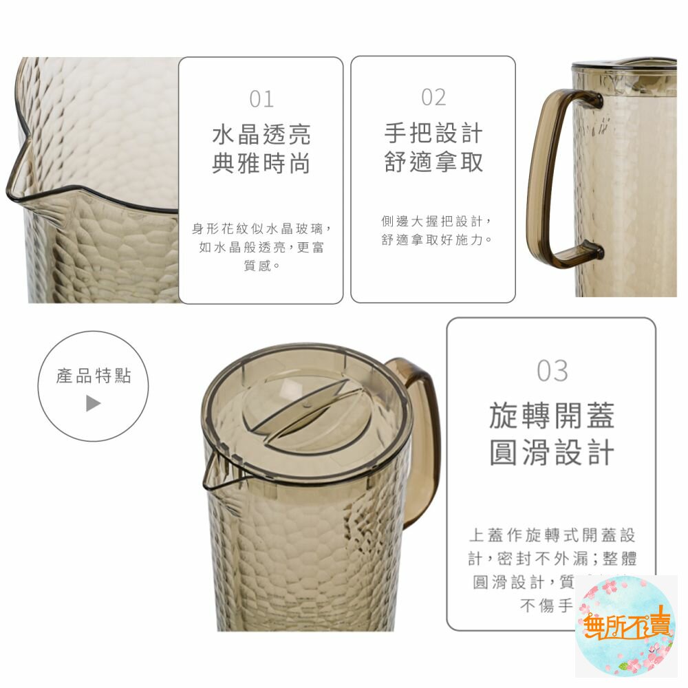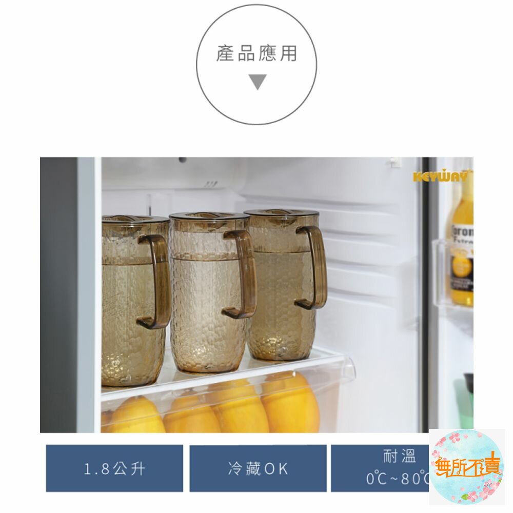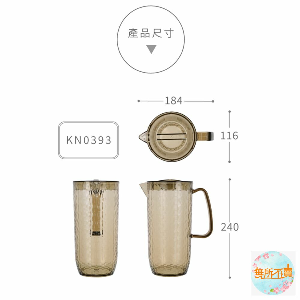 KN039-3 黃水晶冷水壺1.8L 產品編號:KN0393 尺寸:184x116x240mm 產品特色 身形花紋似水晶玻璃,就如水晶般透亮,更富質感,典雅時尚; 握把設計,拿取便利,適合常溫或冷飲的存放,耐溫0度C~+80度C。