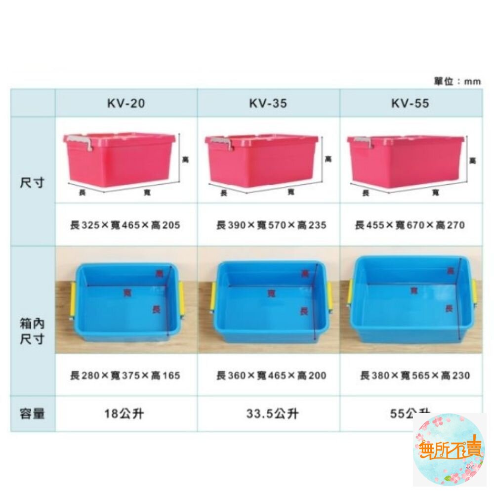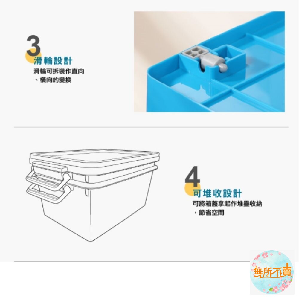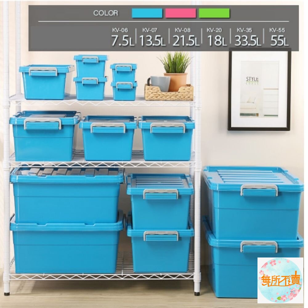 類工業風設計,繽紛亮眼色調,扣環式箱蓋設計,闔蓋防塵,可作堆疊放置,亦可層層堆疊收納,節省空間,盒蓋凹槽,使堆疊更穩固;其中小(KV20)、中(KV35)、大(KV55)之產品,底部有滑輪設計,可方便移動;有各式尺寸,可供選擇。