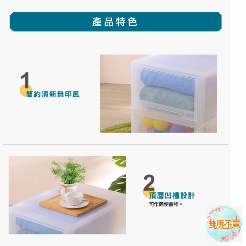 簡約透明色系,易於檢視內容物,清楚分類,長條方正手把,便於拉取,抽屜內附輪設計,更容易拉開,頂層作凹槽設計,堆疊更穩固,亦可簡便置物;適用於各式衣物、玩具、雜物等收納,可層層堆疊,節省空間,抽屜內卡榫設計,可防止抽屜掉落,亦可搭配鐵架、系統櫃使用,方可與LF抽屜整理箱(視窗)、LF抽屜整理箱(平板) 同尺寸之產品堆疊組合。