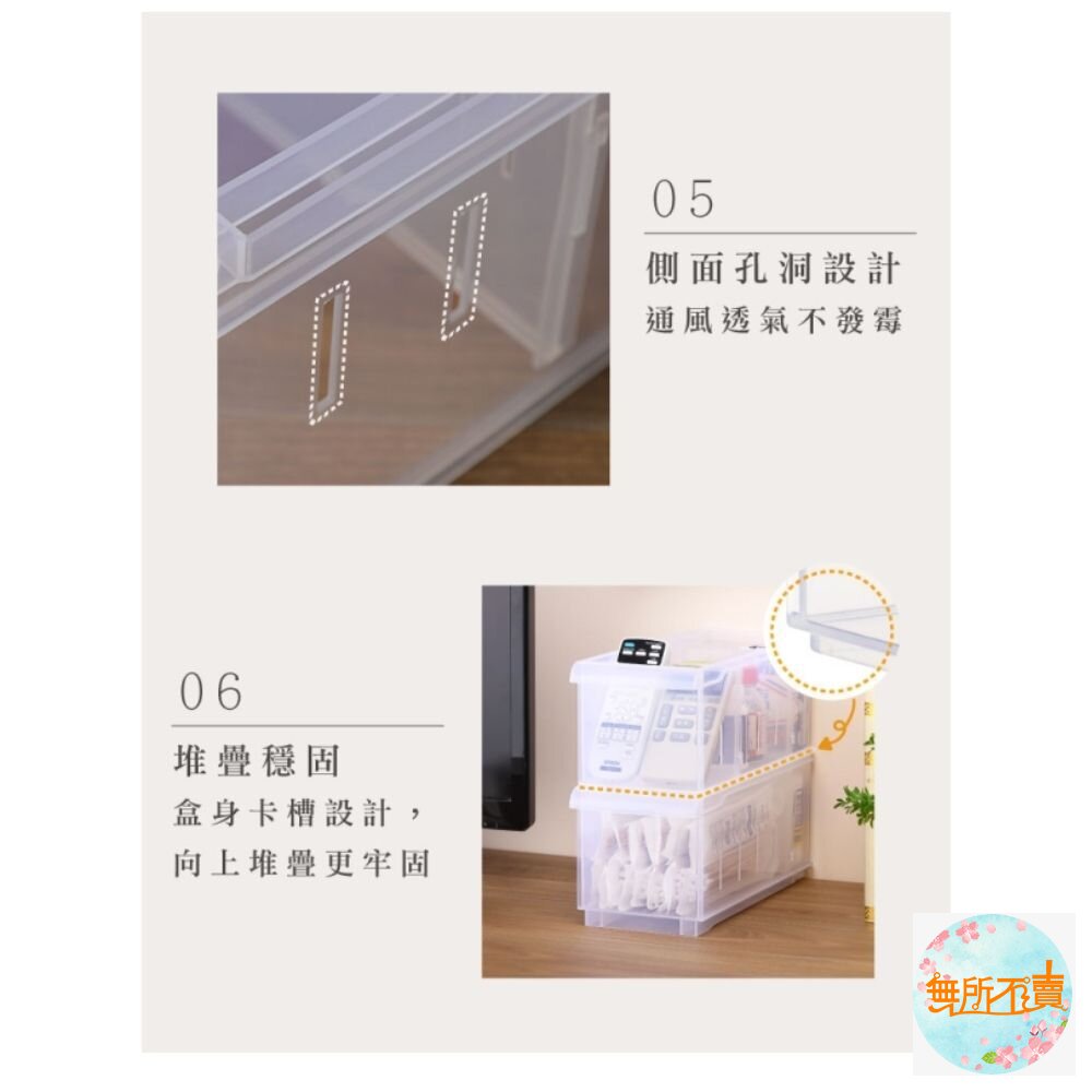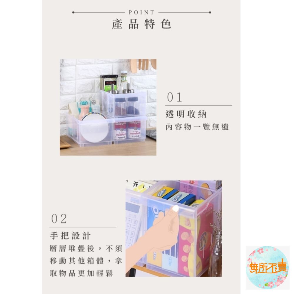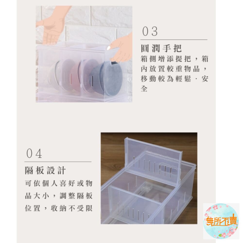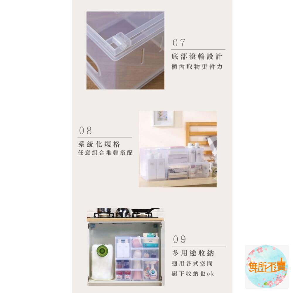 多用途收納盒,光亮剔透色系,一目了然,可用於廚房用品、衛浴用品、冰箱物品等之收納,可作堆疊,節省空間,亦可搭配系統櫃使用,附輪設計,方便移動;手把設計,方便拿取,附活動式隔板,可依需求自行分隔,透孔設計,通風透氣,有各式尺寸,可供選擇,輕便堆疊,自由搭配。