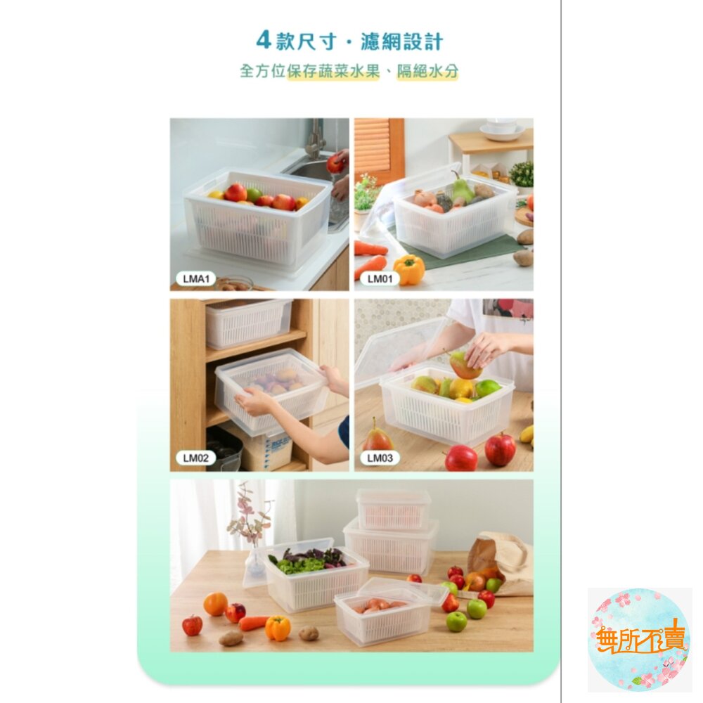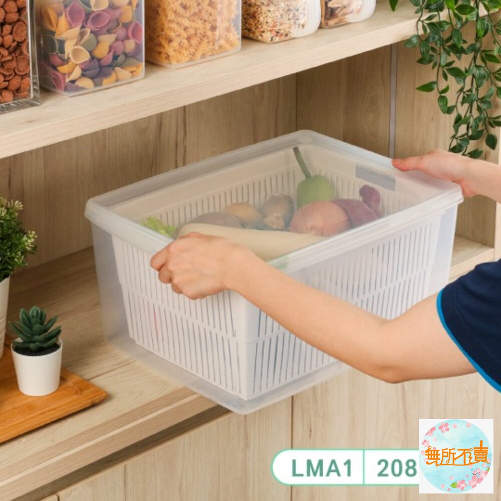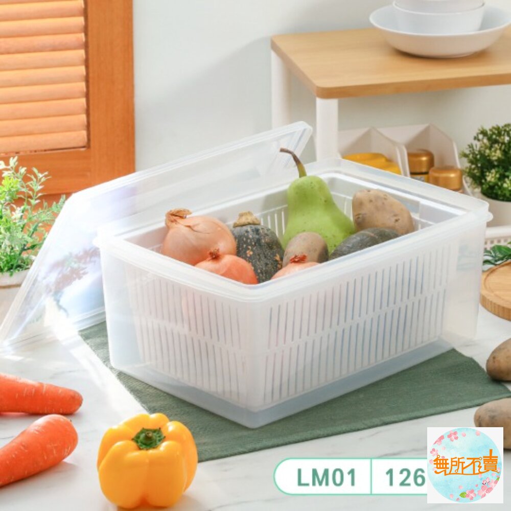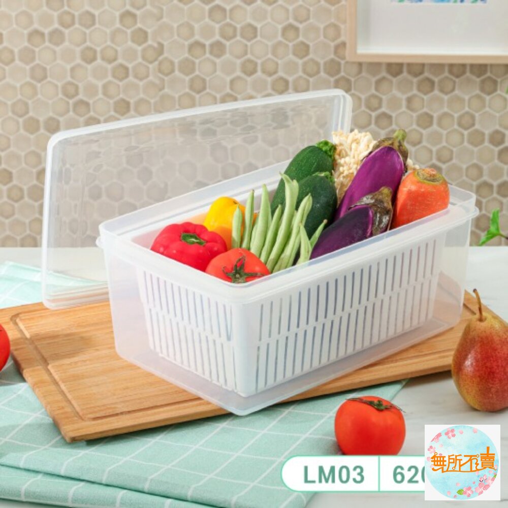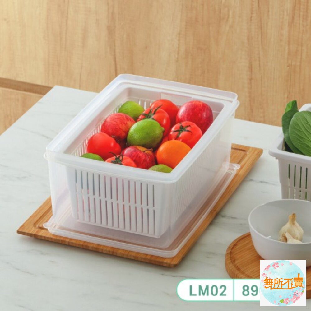 一物多用的便利設計,內附瀝水籃,可單獨使用,雙層設計,保鮮更持久,用於蔬果食材的存放;