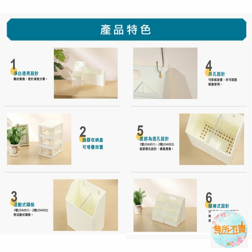 適用於化妝品、文具、各式小物等收納,其中抽屜納盒可堆疊放置,1號(OA051)、2號產品(OA052)附活動式隔板,吊孔設計,可掛起放置,