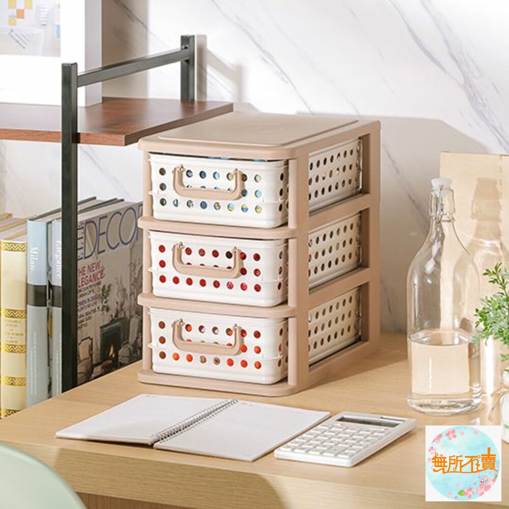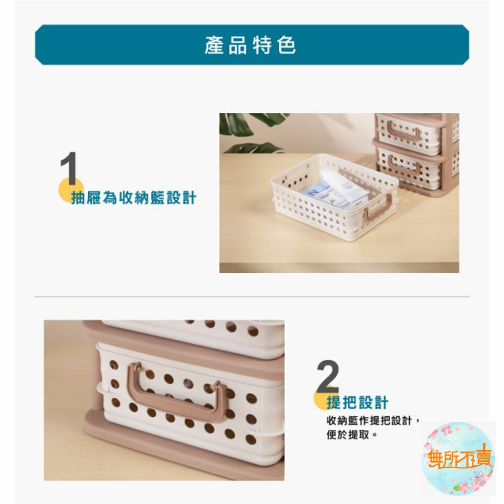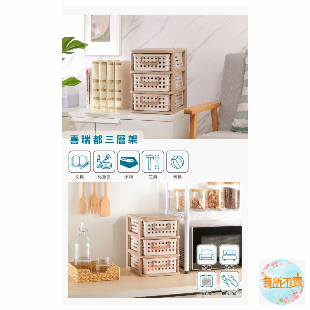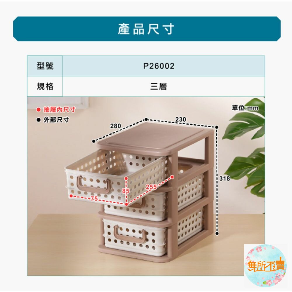 P2-6002 喜瑞都三層架 產品編號:P26002 尺寸:280x230x318mm 產品特色 米色與褐色的搭配,簡約典雅,抽屜為收納籃設計,有圓形透孔、提把設計,通風透氣,拿取便利,可層層堆疊。