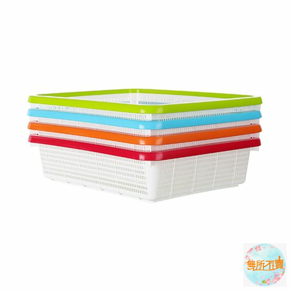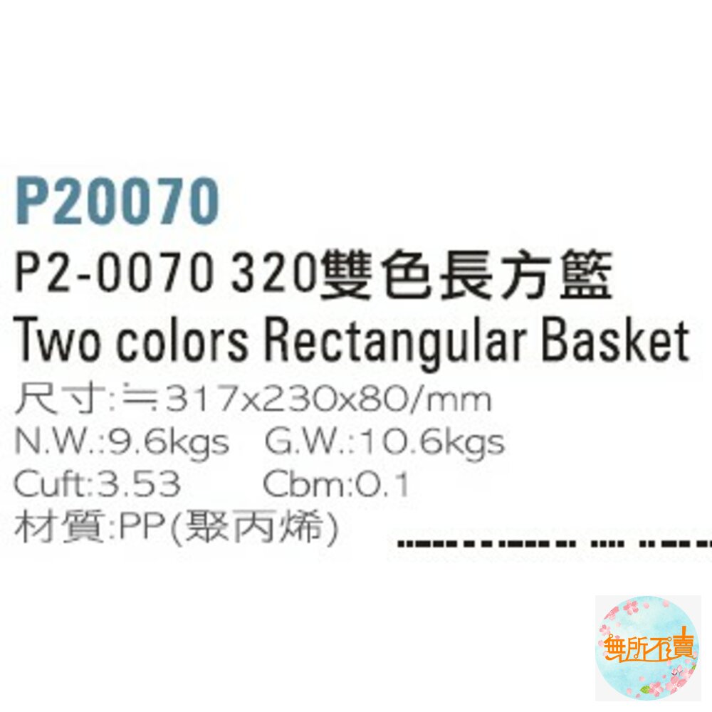 P2-0070 320雙色長方籃 產品編號: P20070 尺寸:371x230x80mm 產品特色鮮亮外框,雙色亮眼設計,淺型瀝水籃,廚房好幫手,適用於餐具碗盤的放置,透孔設計,通風瀝水;亦可堆疊收納放置,節省空間,有活力淺綠、自由水藍、開朗橘、熱情紅。