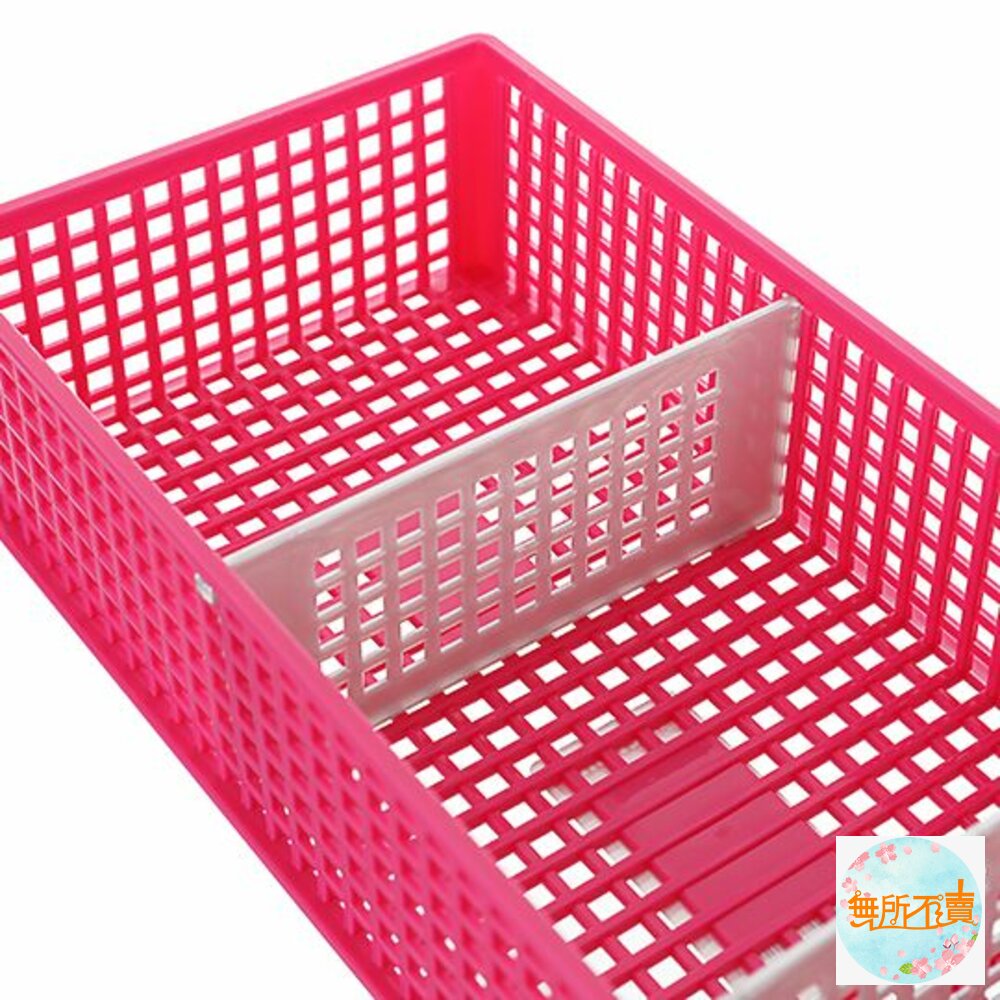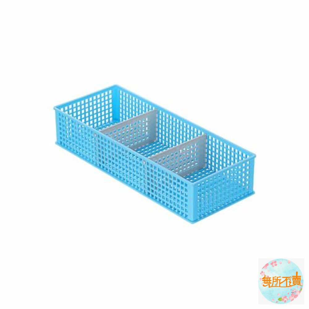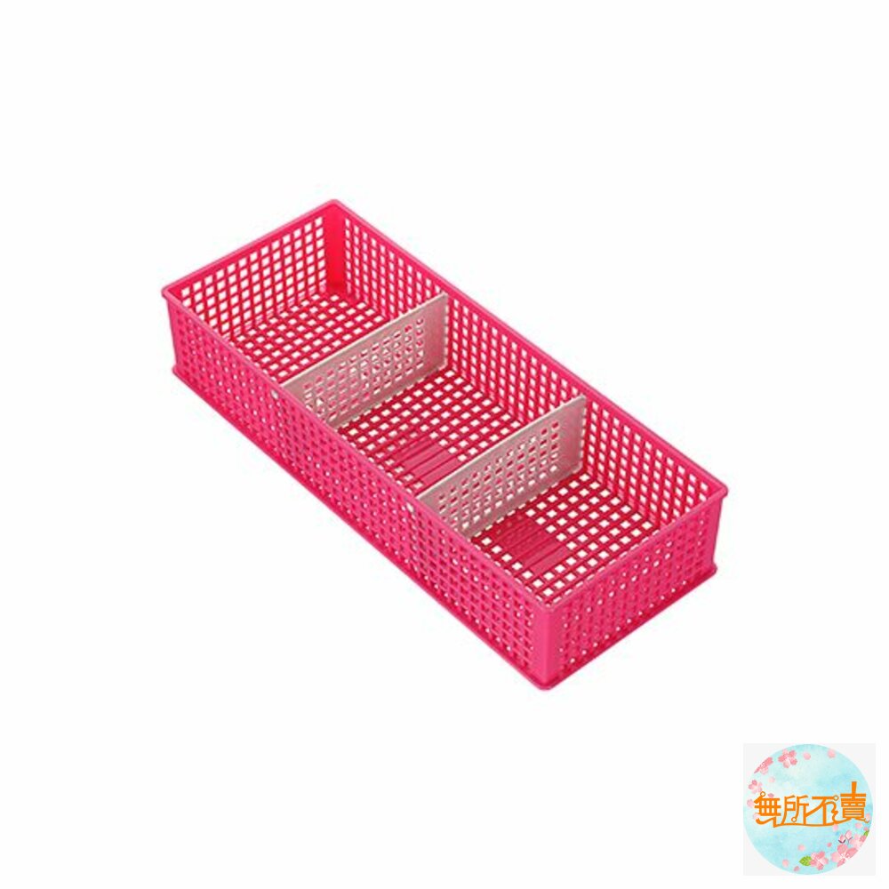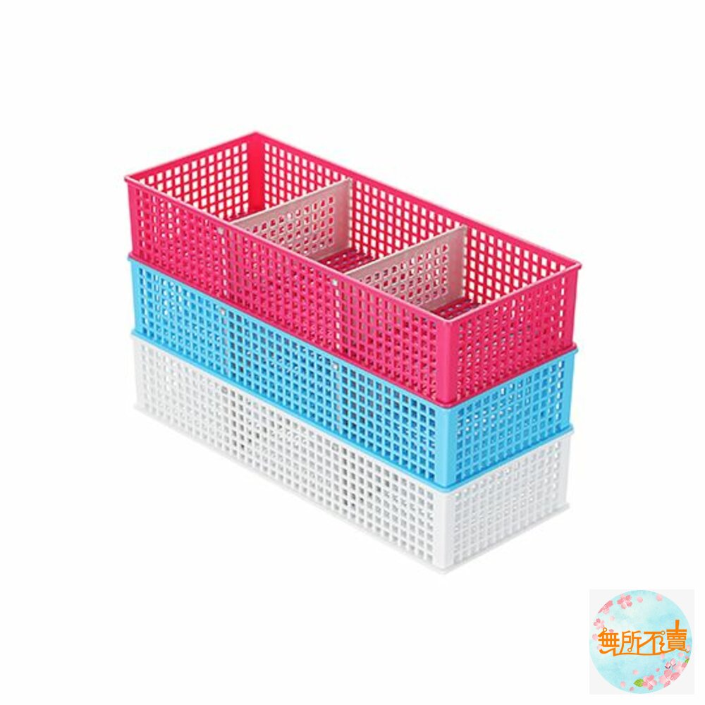P2-0072優美三格小物籃(淺型) 產品編號:P20072 尺寸:300x120x61mm 產品特色 材質輕巧,繽紛色調,適用於各式雜物、文具等小物的收納, 籃面作網底設計,通風透氣,附活動式隔板,可隨需求自由分格, 亦可層層堆疊,有甜美桃紅、奔放水藍、潔淨白,可供挑選。