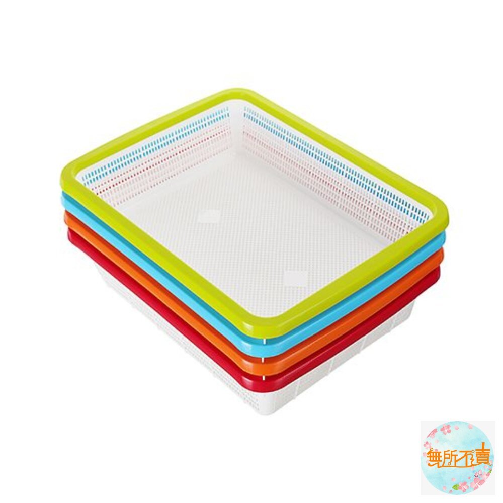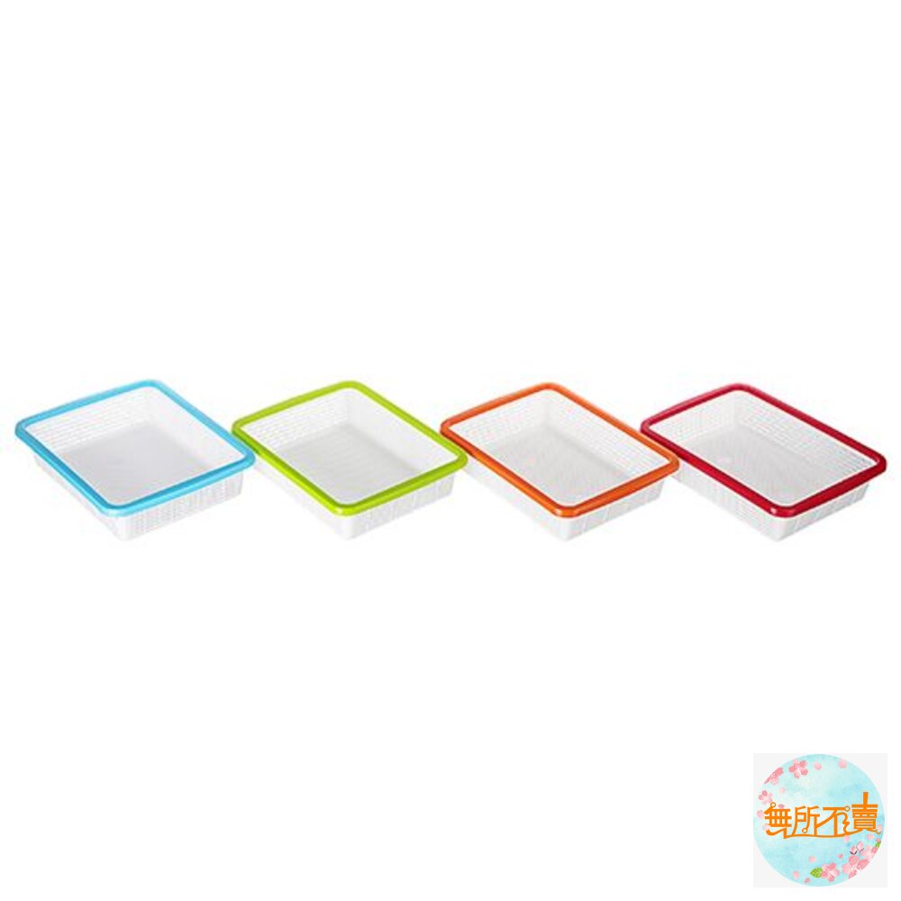 產品特色鮮亮外框,雙色亮眼設計,淺型瀝水籃,廚房好幫手,適用於餐具碗盤的放置,透孔設計,通風瀝水;亦可堆疊收納放置,節省空間,有活力淺綠、自由水藍、開朗橘、熱情紅,可供選擇。