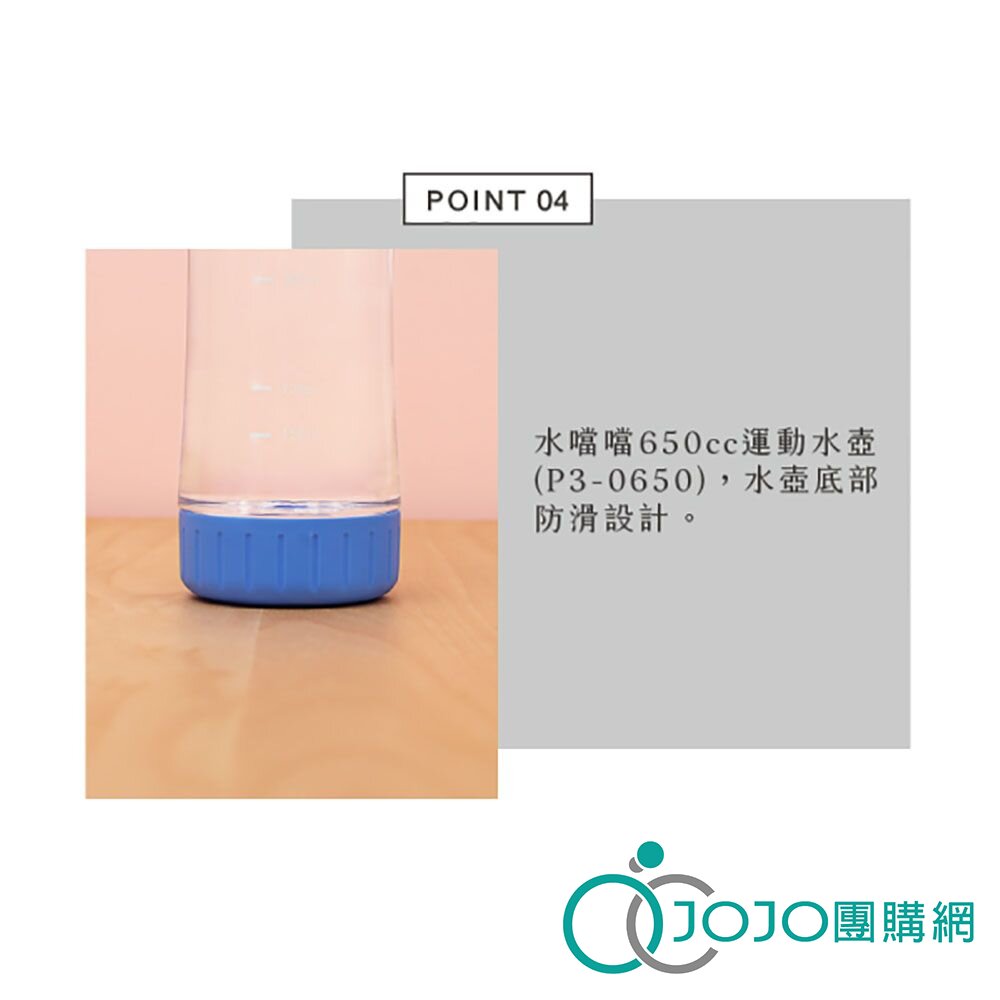 瓶身凹槽設計,符合人體工學,方便拿取,瓶底作物霧面設計,更富質感;其中一項產品650CC水噹噹運動水壺(P30650),水壺底部有防滑設計,但並無瓶身凹槽設計;手環設計攜帶便利,有容量刻度,可作測量,耐溫-20度C~+100度C,有各式容量之款式,可供選擇。