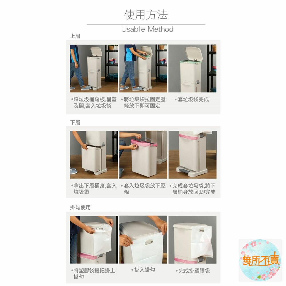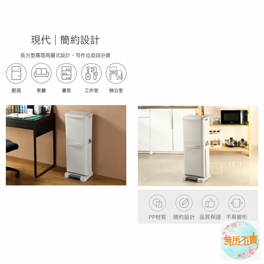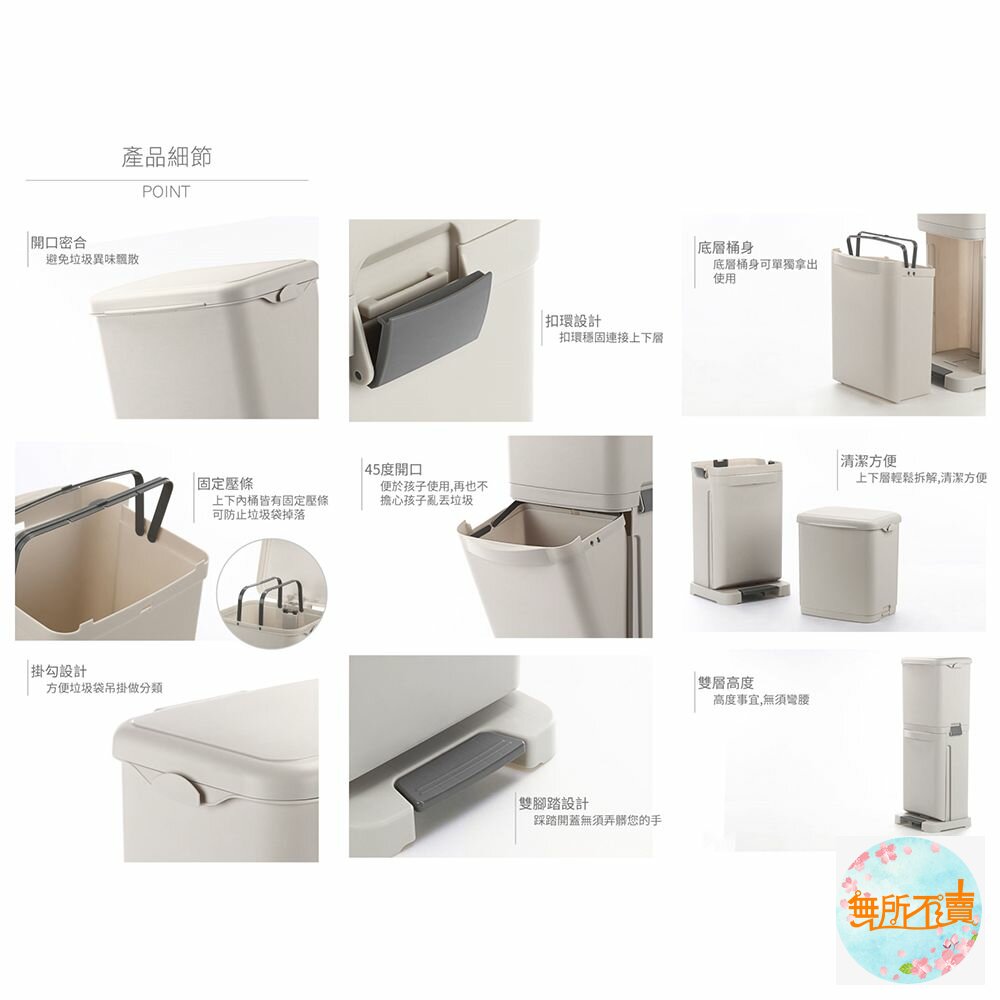 台北分類垃圾桶 40公升是以方便操作為主要訴求,腳踏式開關設計讓您不需辛苦彎腰掀蓋,伸腳輕踩即可,下層分類桶更只需輕輕直接拉出即可,利用側面雙掛鉤設計,可荷重1kg,並可再加以增加分類,上下二格共擁有40公升容量最適合一般家庭使用