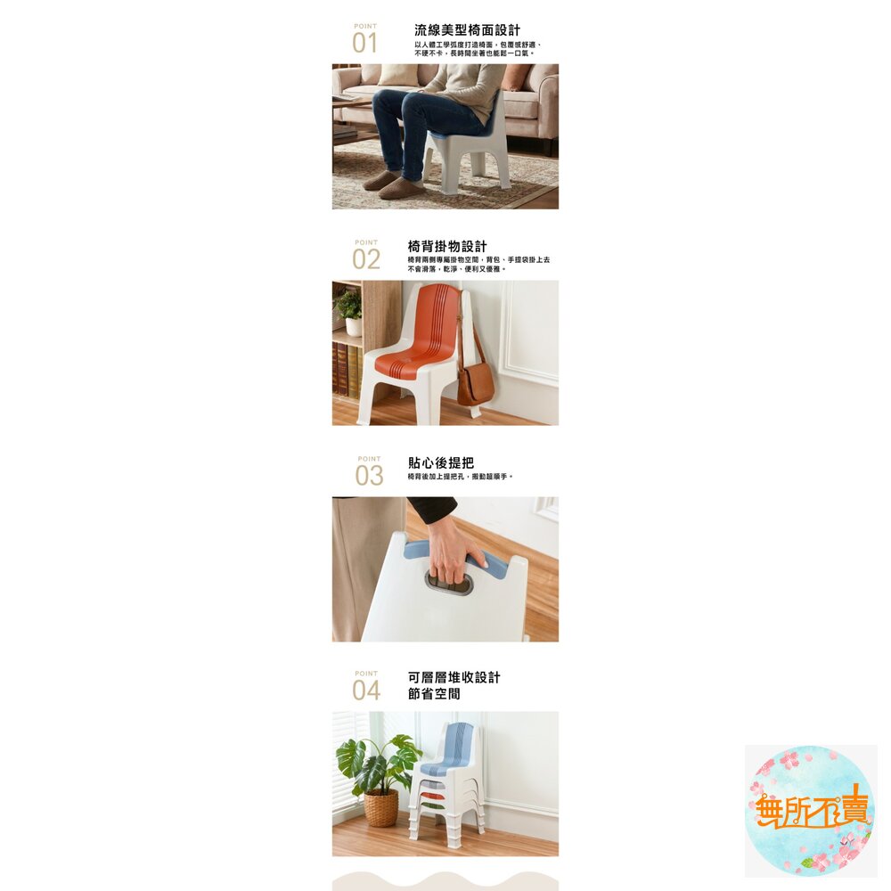 無論居家、露營或戶外活動都能輕鬆搭配。椅面採流線弧形設計,符合人體工學,久坐也舒適不累。椅背兩側採凸起設計,可支撐背包或物品穩定放置;後側配有提把孔,拿取移動更便利,也能輕鬆堆疊收納。中款承重約 80 kg,大款承重約 100 kg,穩固耐用,是日常與外出皆適用的實用好椅。