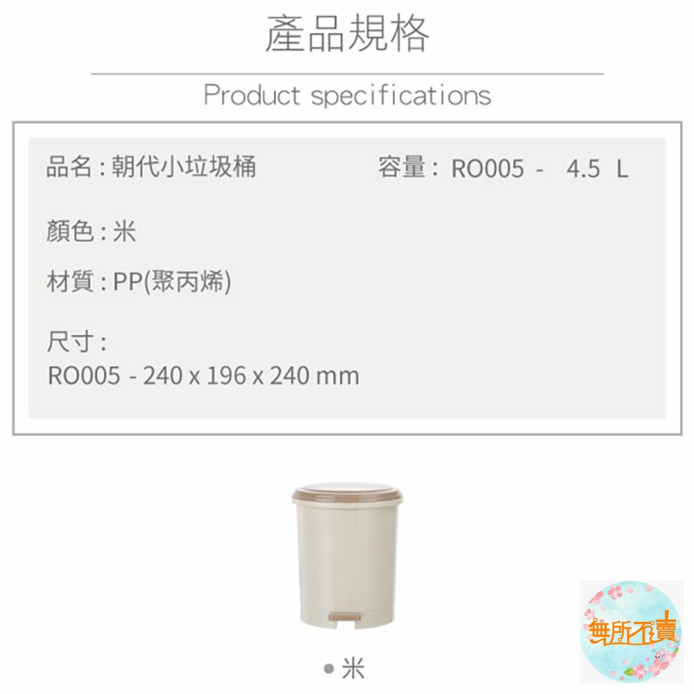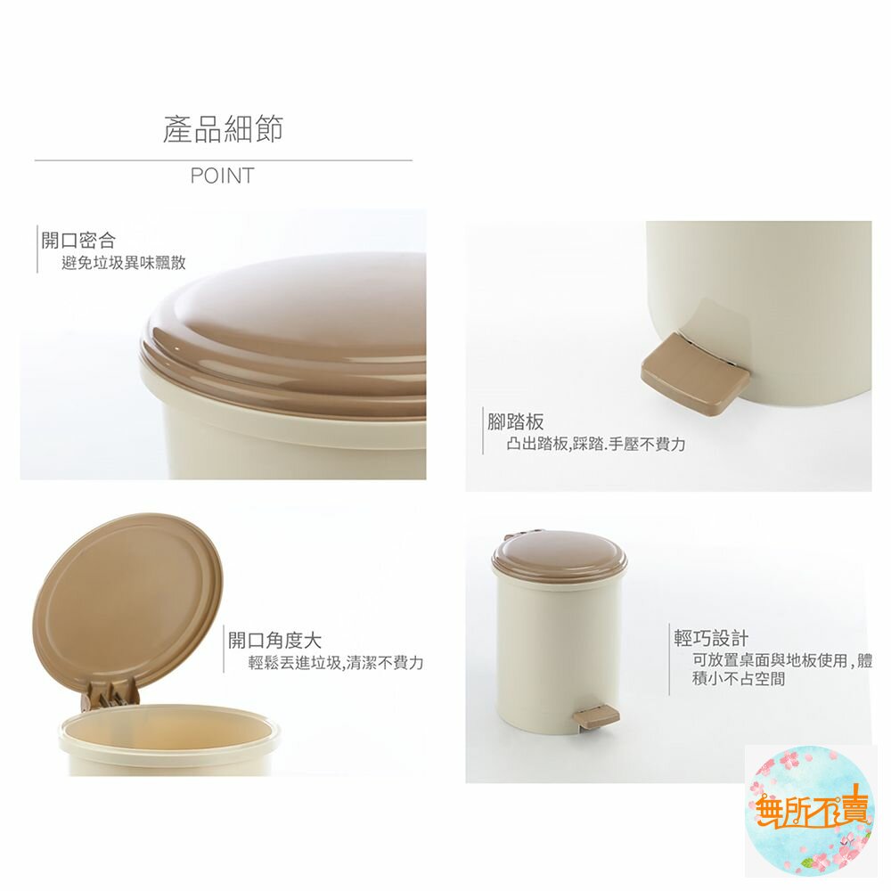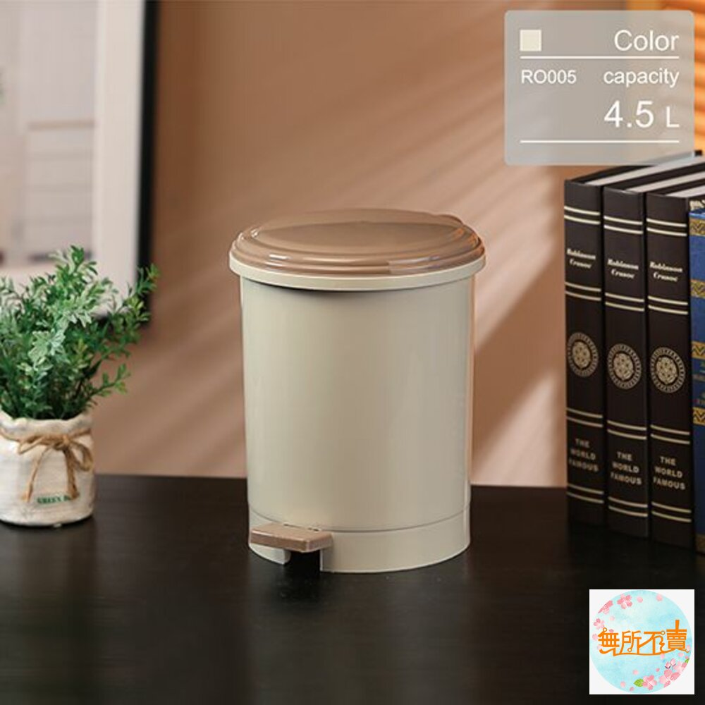 ※超取和蝦皮店到店限1個。 RO-005朝代小垃圾桶 產品編號:RO005 尺寸:240x196x240mm 產品特色 典雅大方的褐米色調,輕巧設計,圓型亮面,光滑俐落,踏式設計,細菌污漬不沾手。